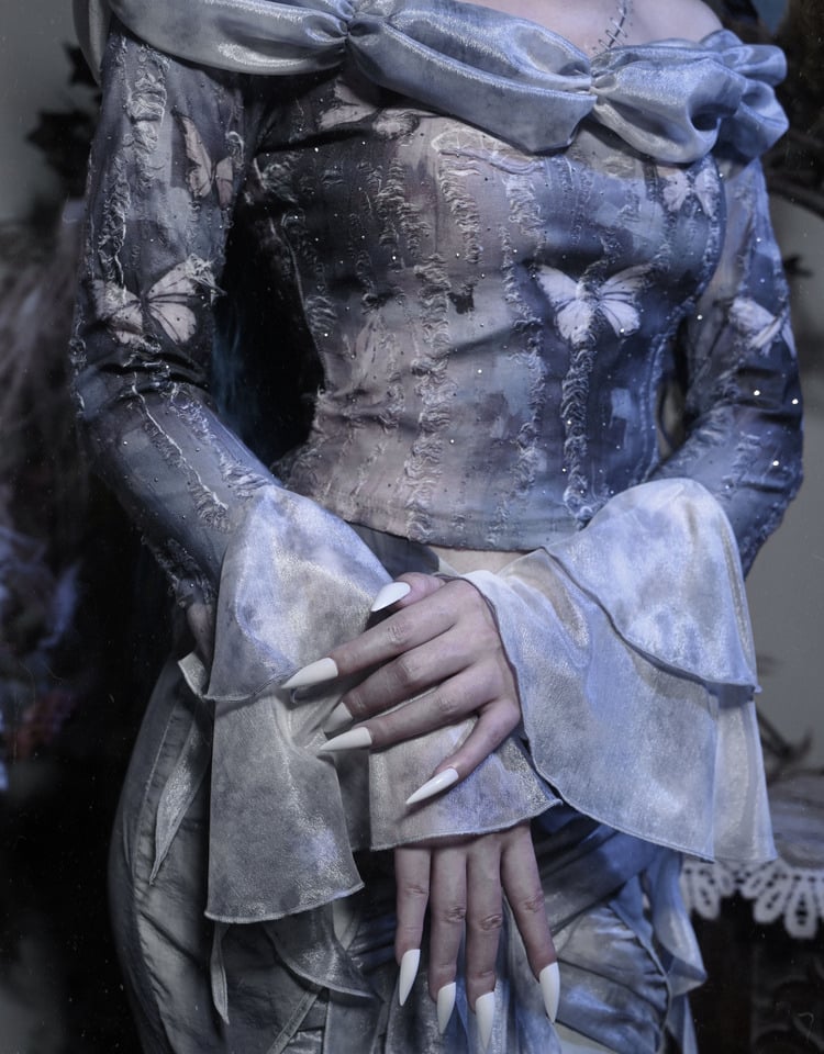 Staubblaues Top mit schulterfreiem Ausschnitt und Schmetterlingsdruck