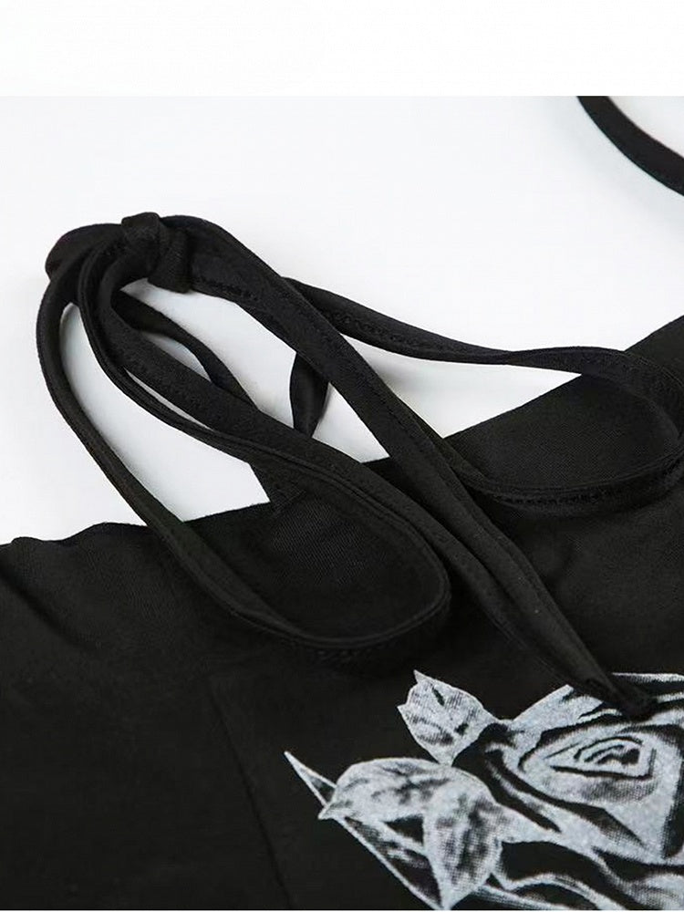 Schulterfreier Ausschnitt, verziert mit floralem schwarzem Strass-T-Shirt-Design Y2K