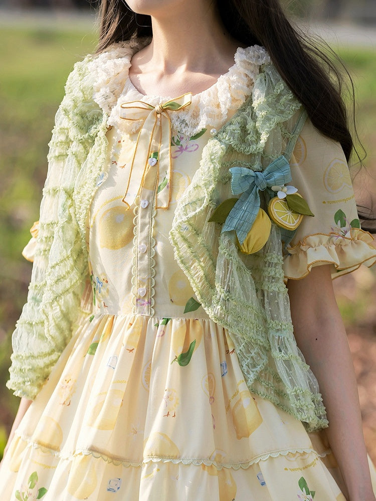 Grünes Tülltop mit offener Knopfleiste und Punkten