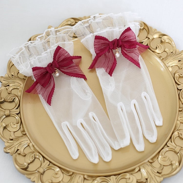 7 Color Options Elegant Lolita White Lace Gloves With Bowknot And Bead Charms