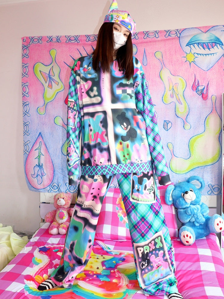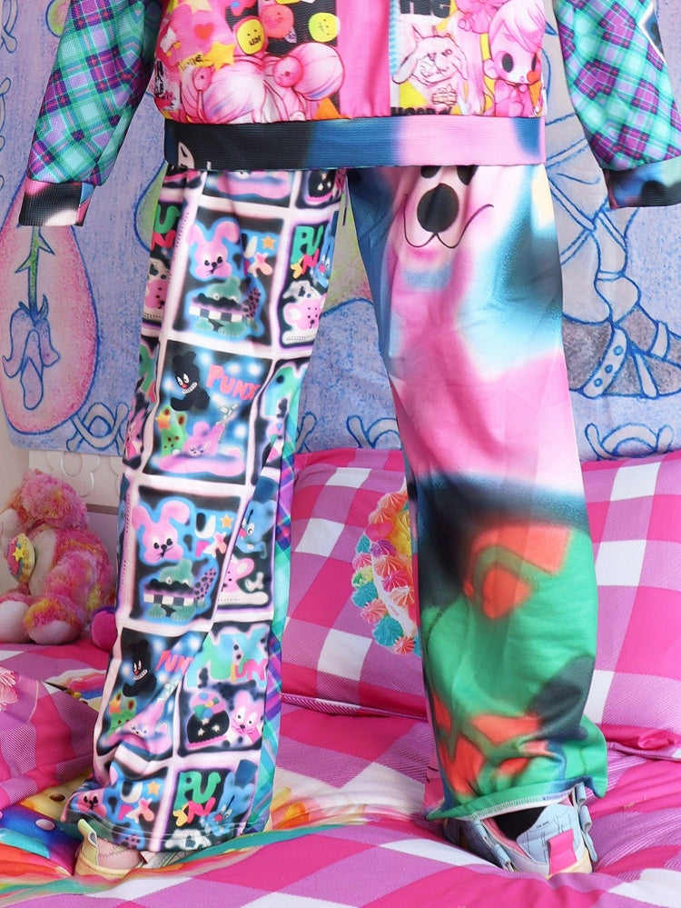 Bunte Y2K-Cartoon- und Buchstabendruck-Karomuster-Schlag-Silhouette-Hose