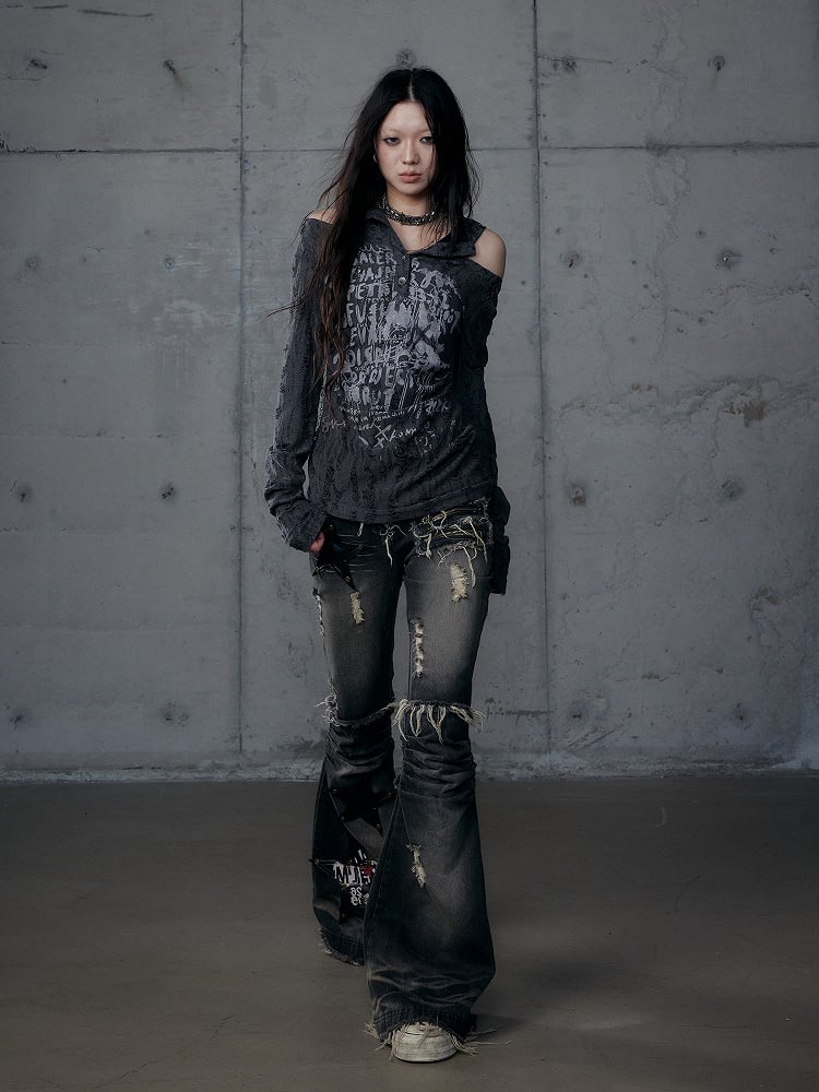 Wasteland Punk Rock – Ausgewaschene schwarze Schlagjeans mit PU-Stern-Patches und offenem Saum
