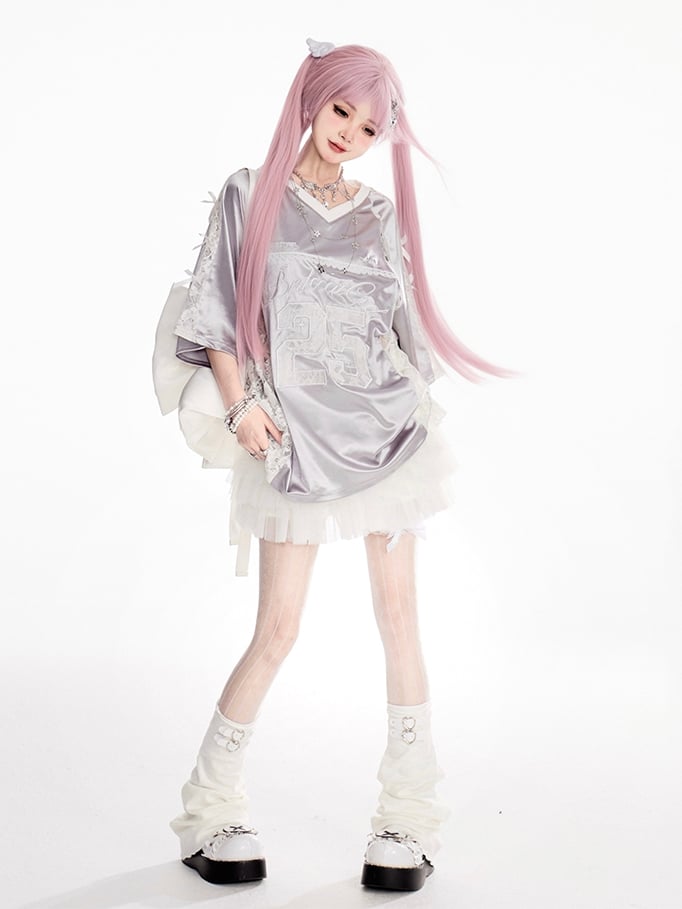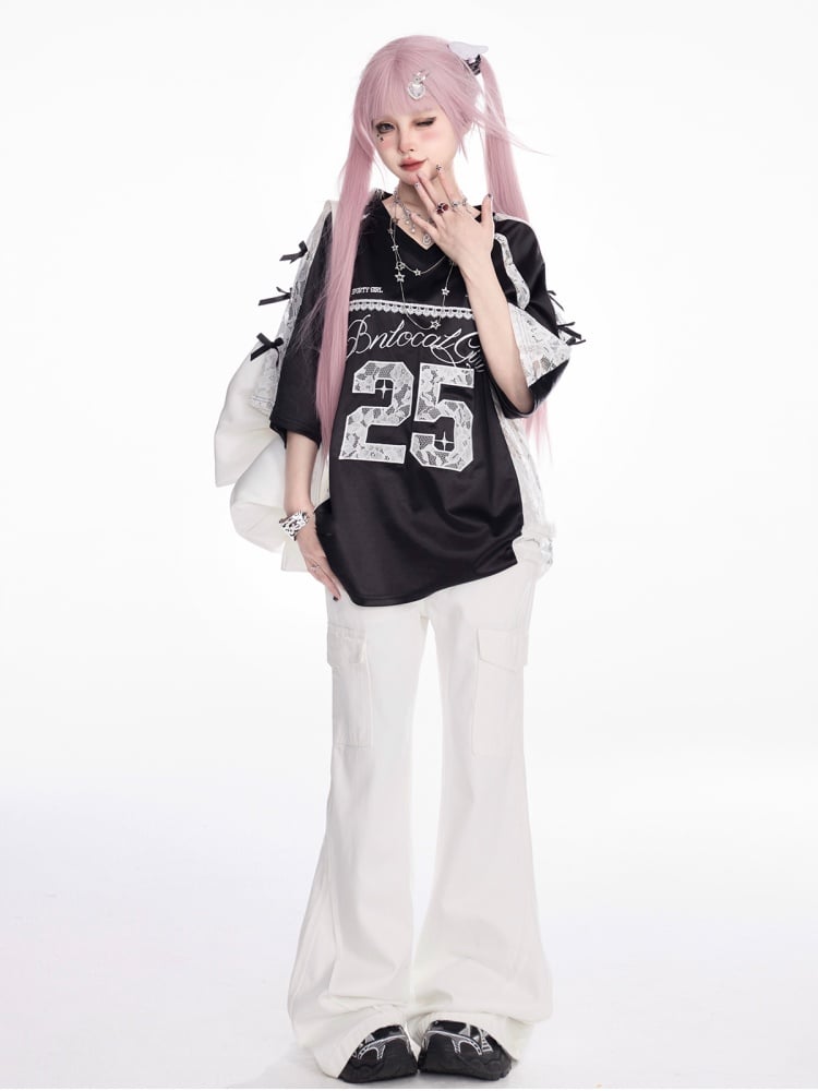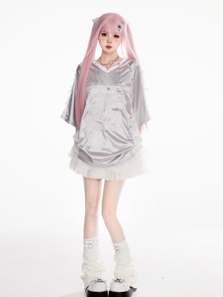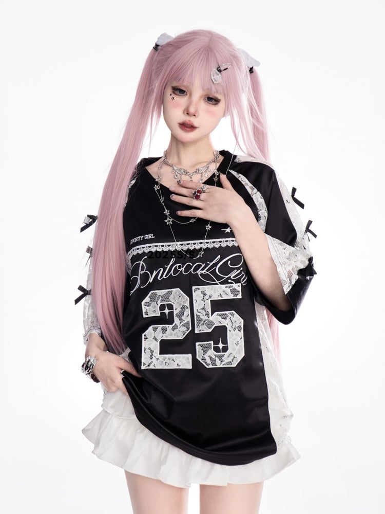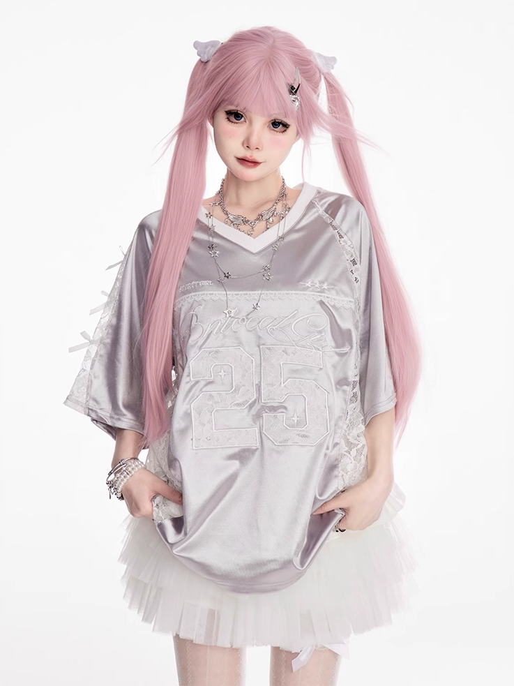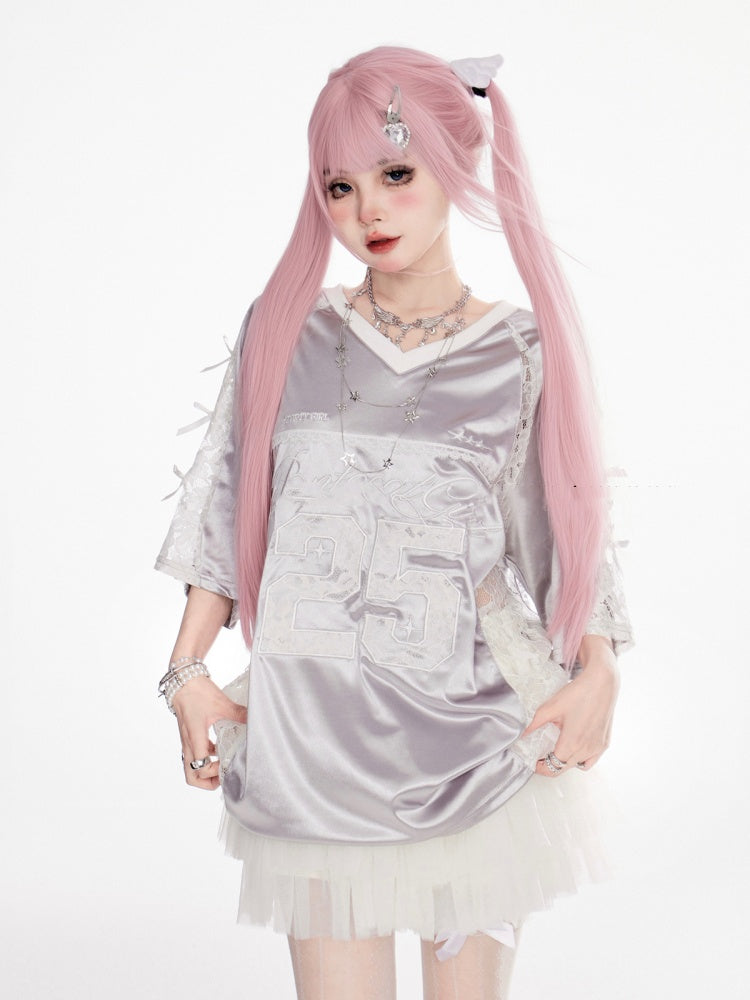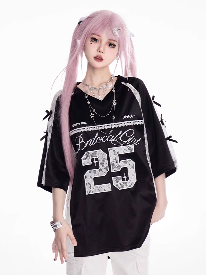 Patches Kontrast Spitze T-Shirt Applikation V-Ausschnitt Satin Schwarz/Silber Nummer