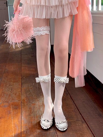 Schwarz/weiße Wadensocken mit Schleife und Tupfenmuster