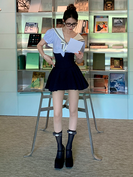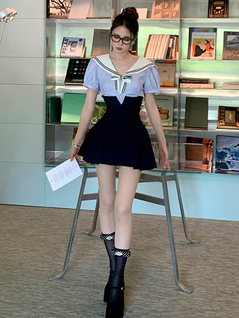 Blau-weißes Old School Lolita Fashion Kleid mit Schleife und Details, JSK-Set