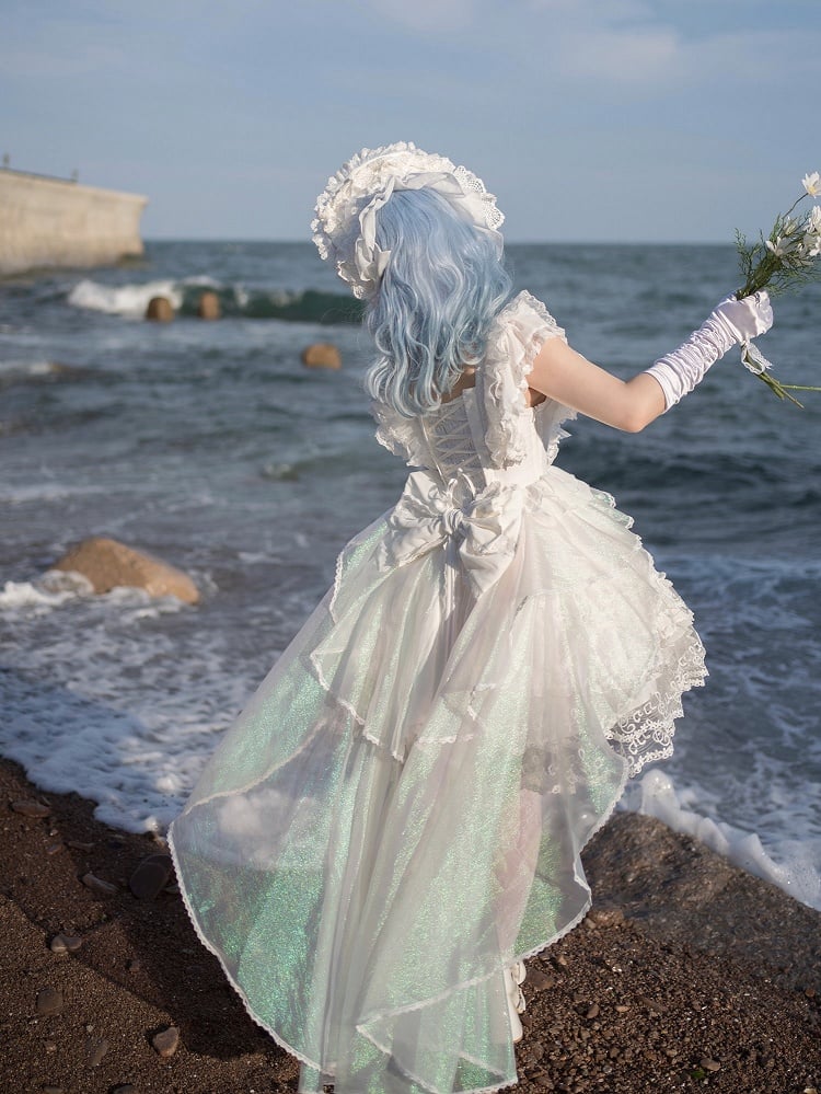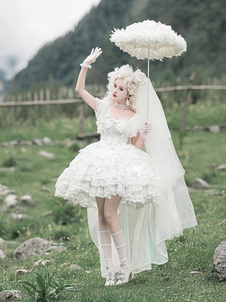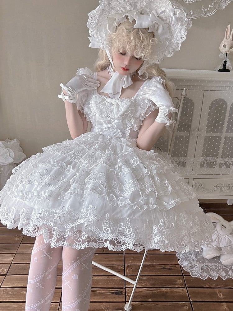 White Lace Layered Lolita Dress with Musical Note Pattern and Bow Accents