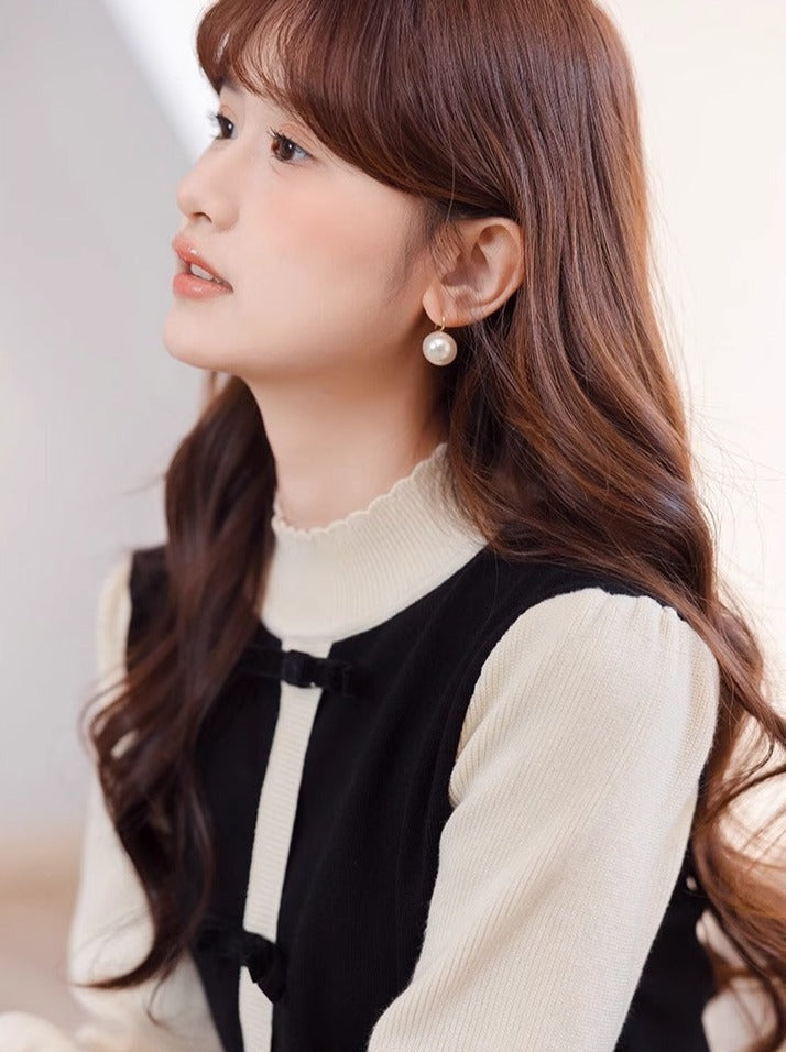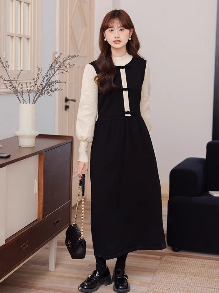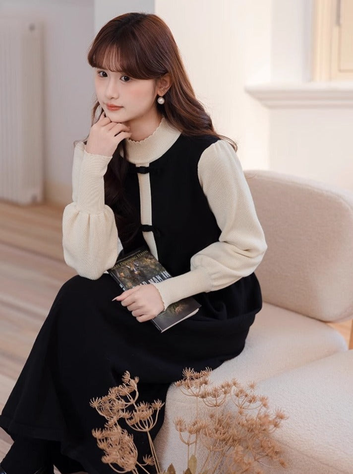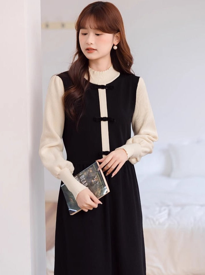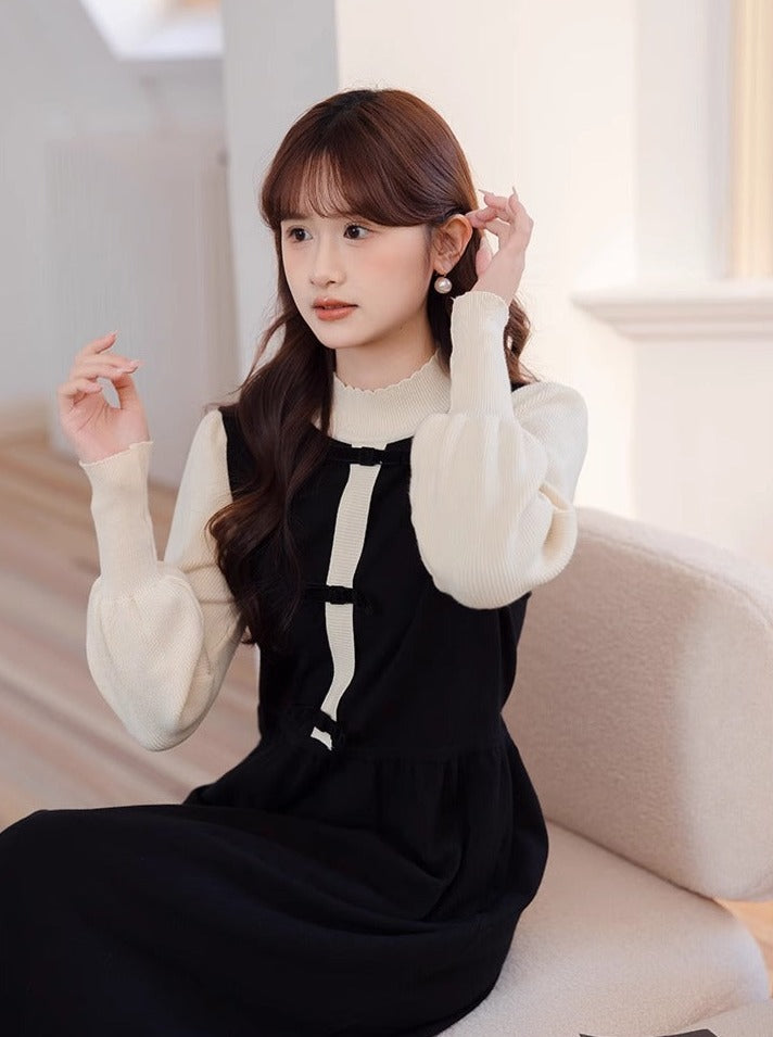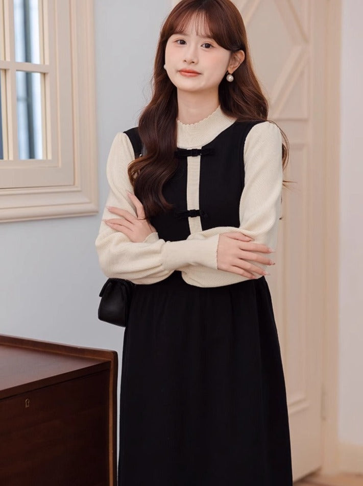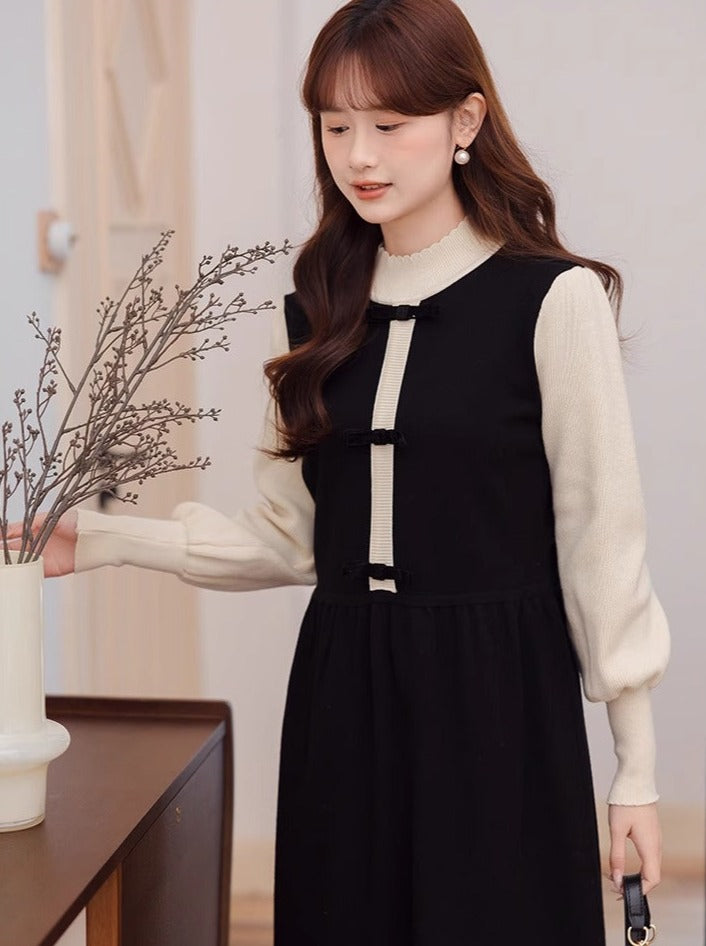 Dieses Halbkleid besticht durch sein einzigartiges zweifarbiges Design und den künstlichen Kragen, der Ihrem Outfit einen Hauch von Niedlichkeit verleiht. Heben Sie sich mit diesem hochgeschlossenen Kleid stilvoll ab.