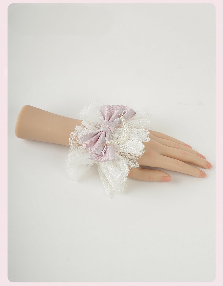 Rosafarbene Handgelenkmanschetten mit großer Schleife, Rüschenbesatz aus Spitze und Perlenkette