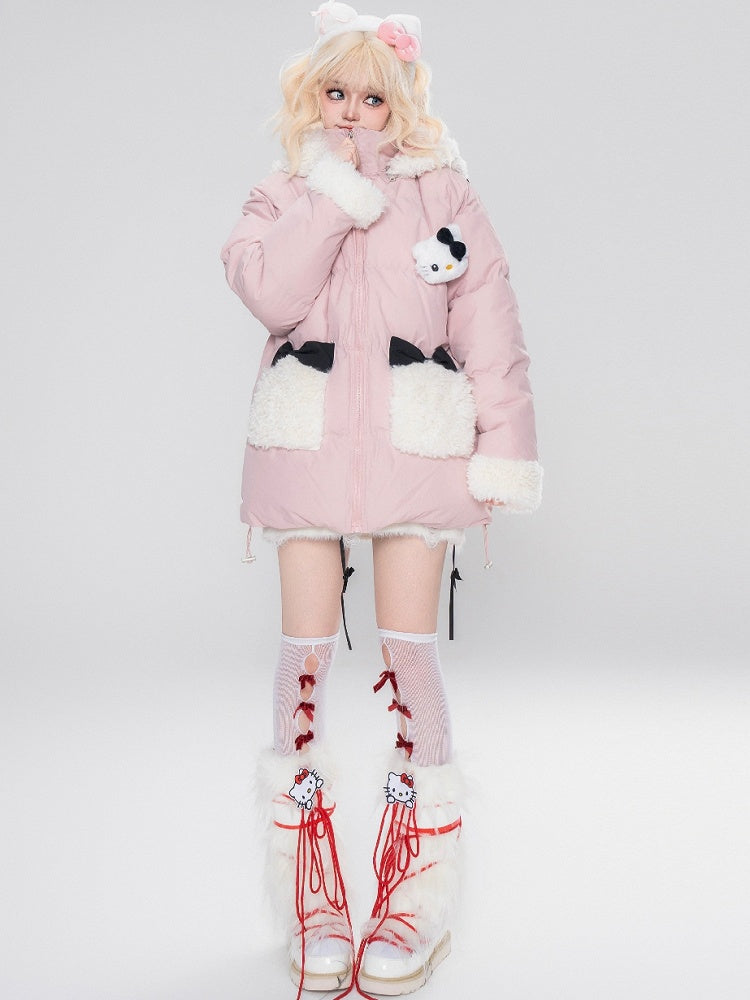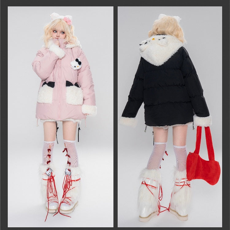 Rosa/schwarze Pufferjacke mit Kapuze und Plüschbündchen mit Kätzchen-Verzierung