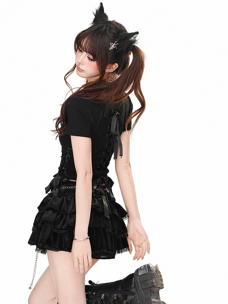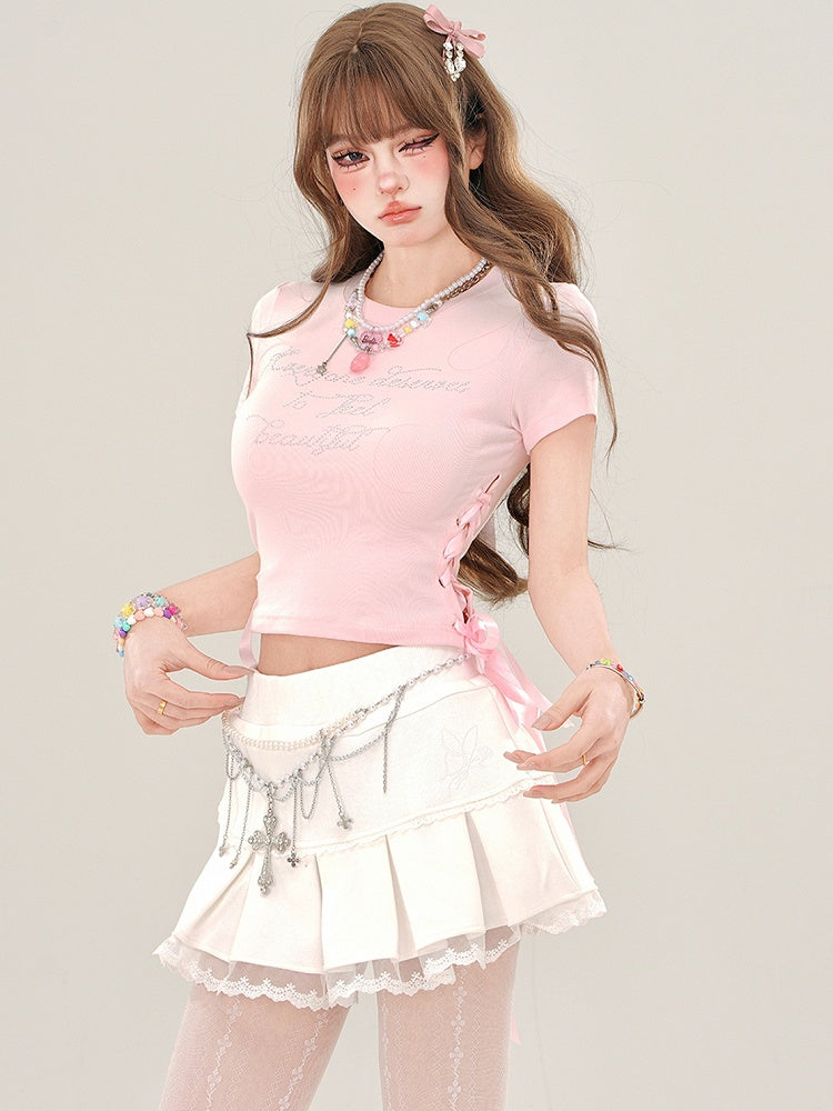 Dieses süße Crop-Top besticht durch eine verspielte Schnürung und funkelnde Strassbuchstaben in Pink und Schwarz. Perfekt, um jedem Outfit einen Hauch von Charme zu verleihen.