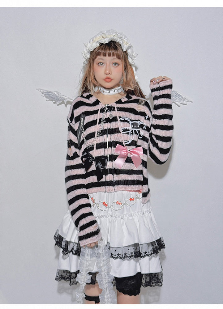 Rosa-schwarz gestreifte Strickjacke mit herzförmiger Schleife und Kettenstrick