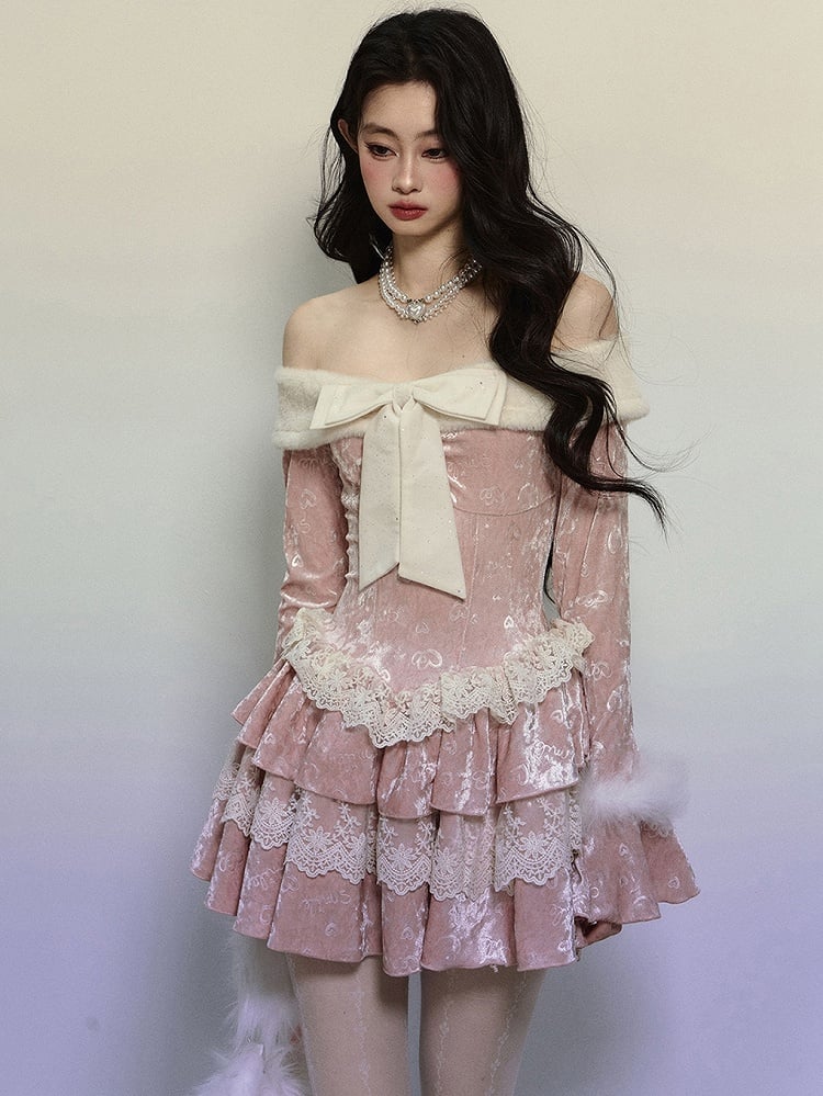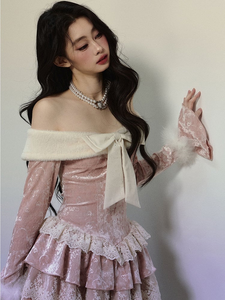 Rosafarbenes, schulterfreies Samtkleid mit Schleifendetails, gestuftem Rüschenrock