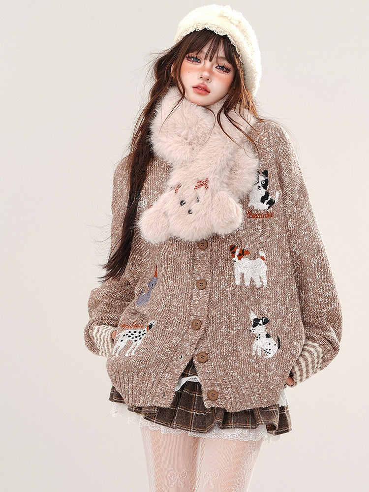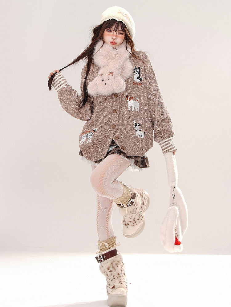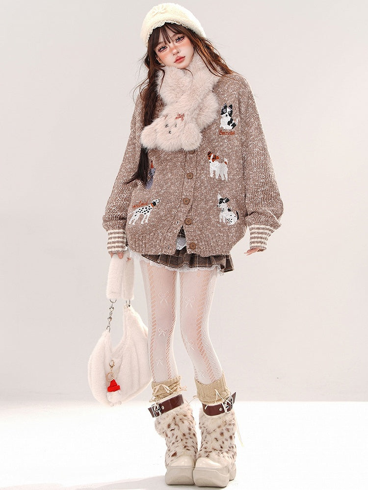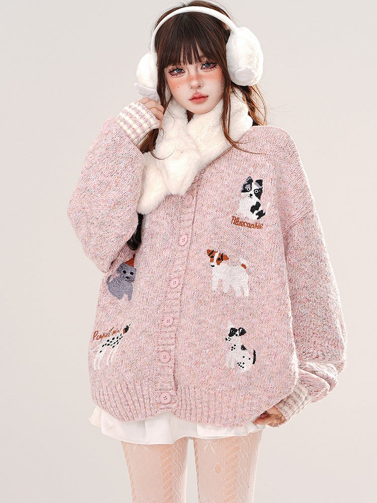 Lockere Strickjacke mit Rundhalsausschnitt und süßen Welpen in Rosa/Kaffee