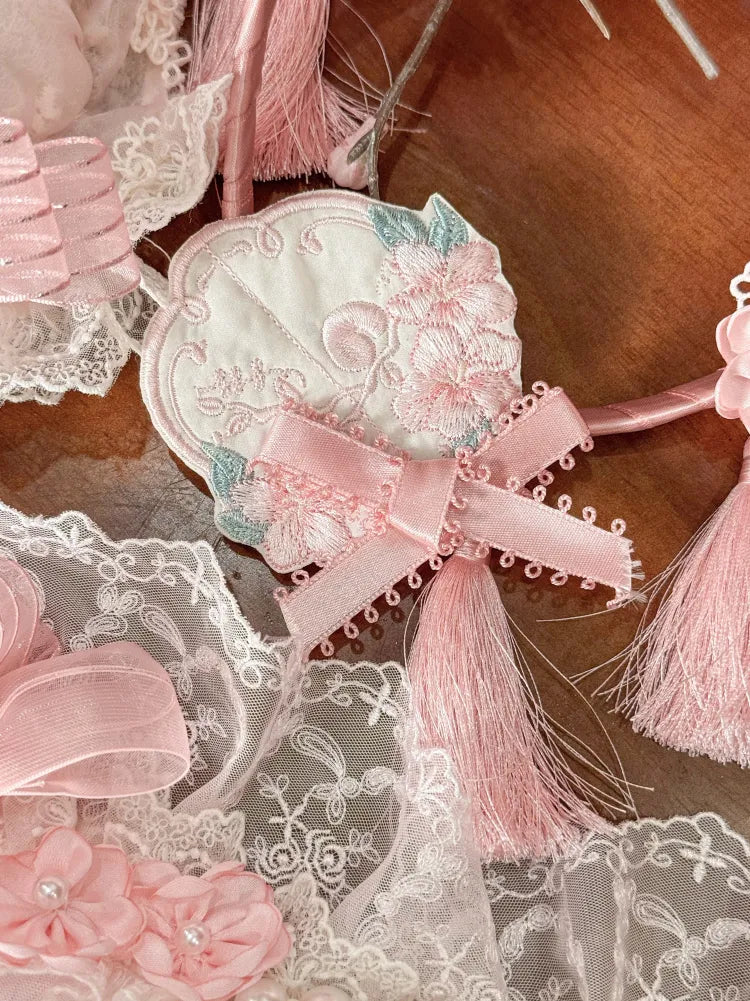 Rosafarbene Brosche mit Blumenstickerei und Quaste