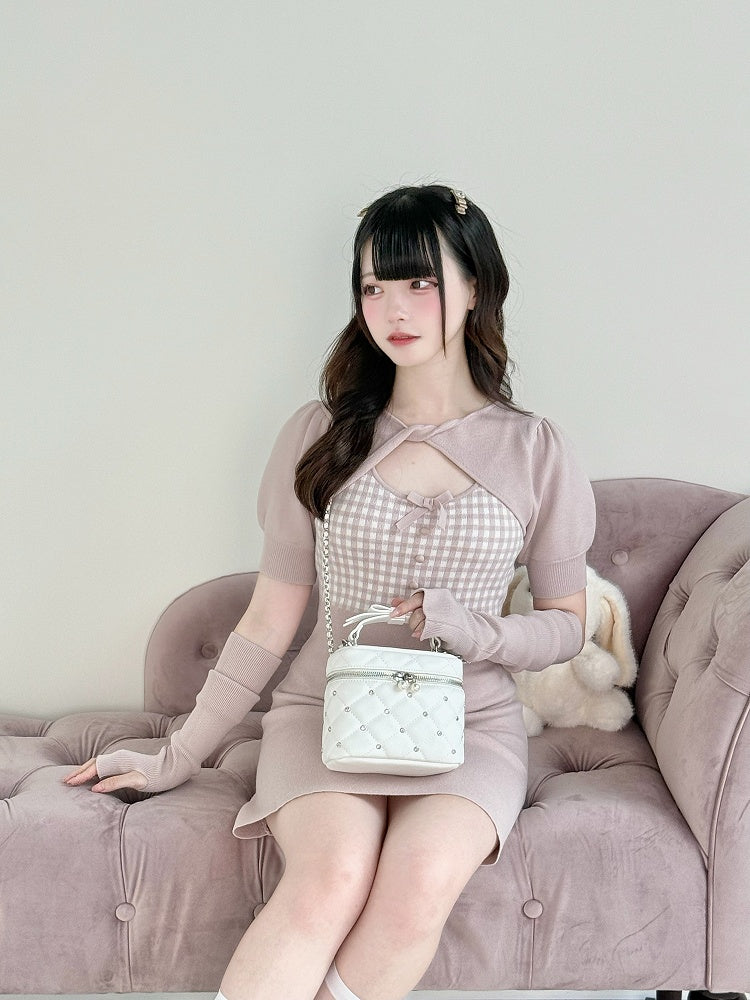 Süßes und ausgefallenes Jirai Kei-Kleid: Rosa karierter Strick mit gedrehtem Halsausschnitt und gewagtem Ausschnitt