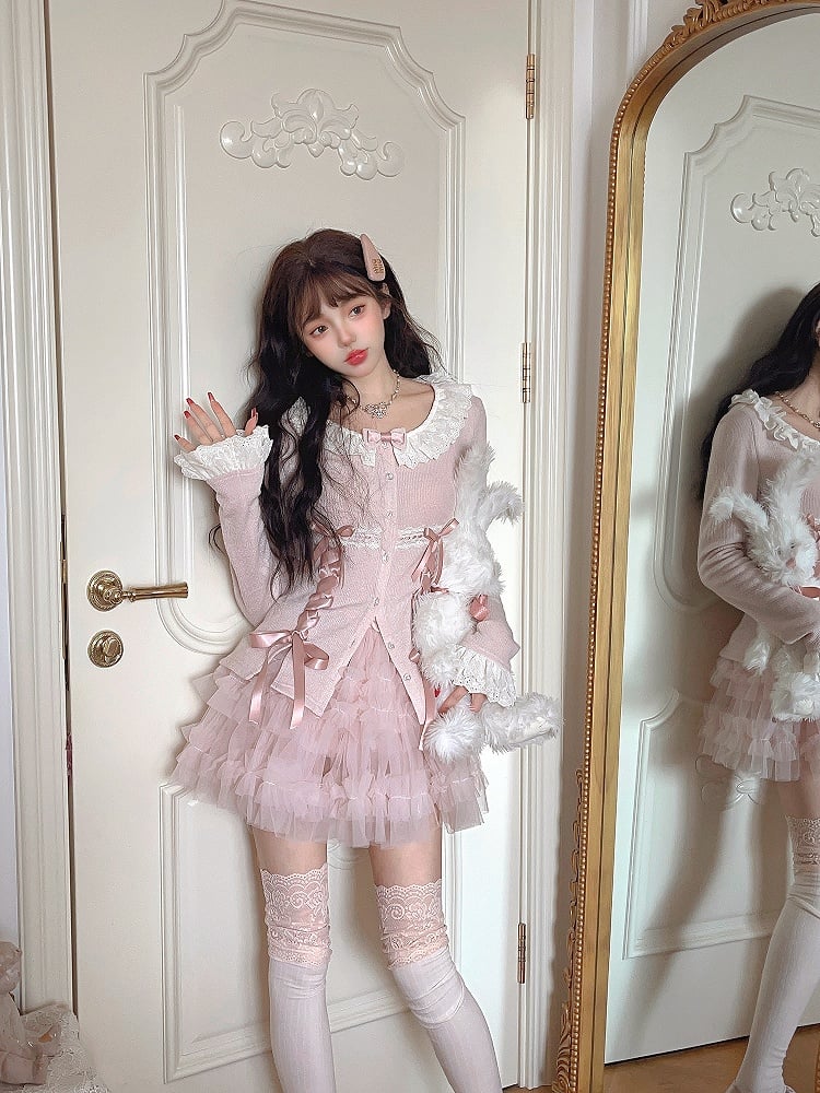 Rosa Strickjacke mit gerüschten Spitzenband-Schleifen-Akzenten