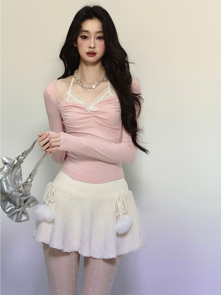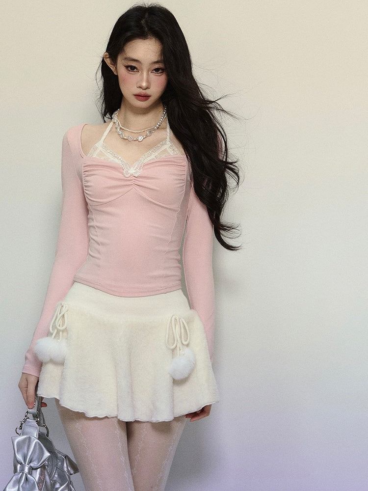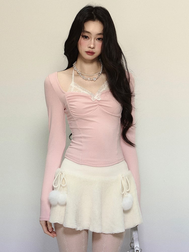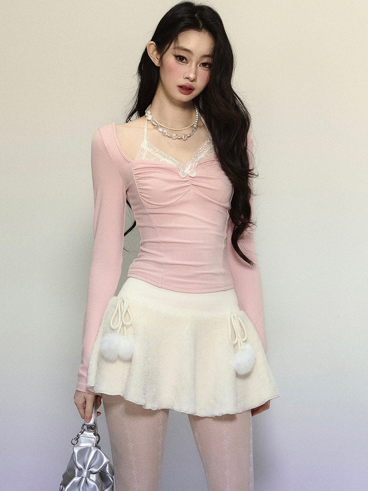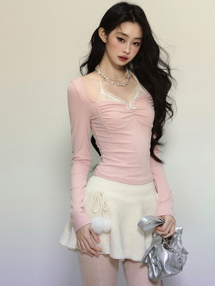 Rosa Spitzenoberteil mit Schmetterlingsausschnitt und Neckholder und langen Ärmeln