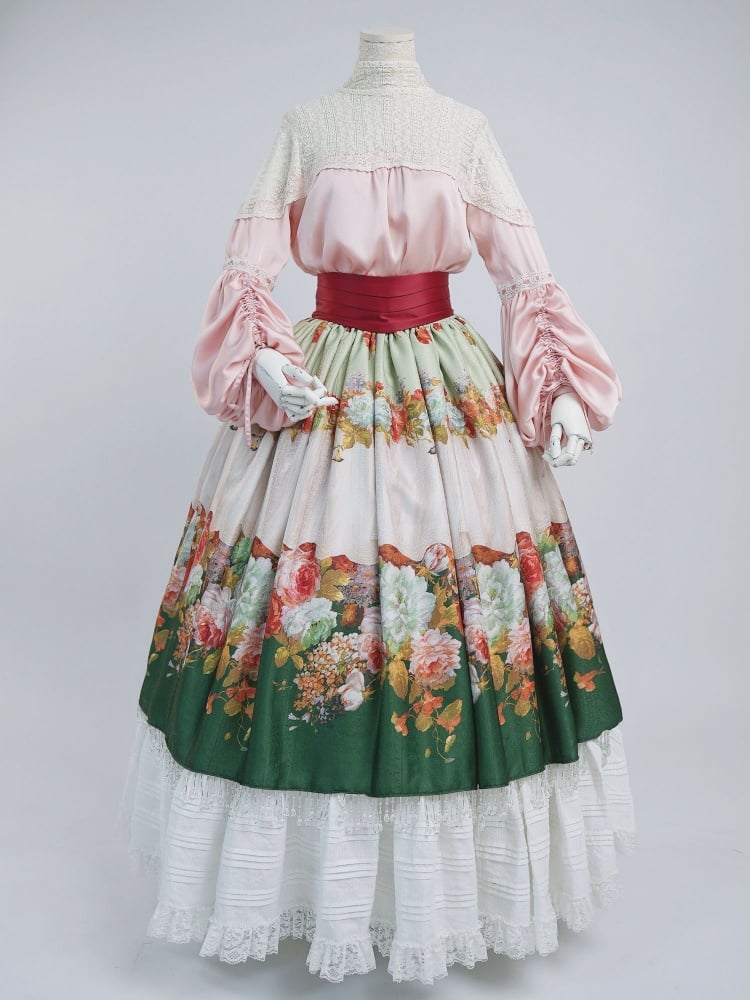 Pinke Poet-Bluse, grüner Rock mit Kristallquaste und Blumenmuster