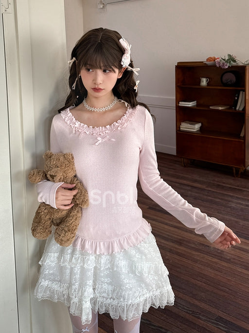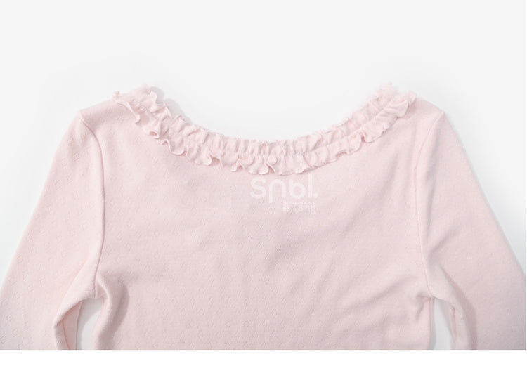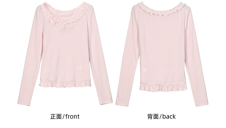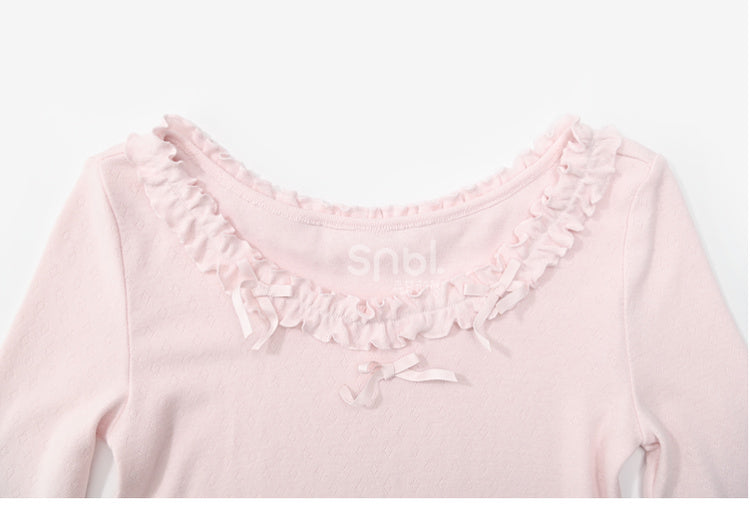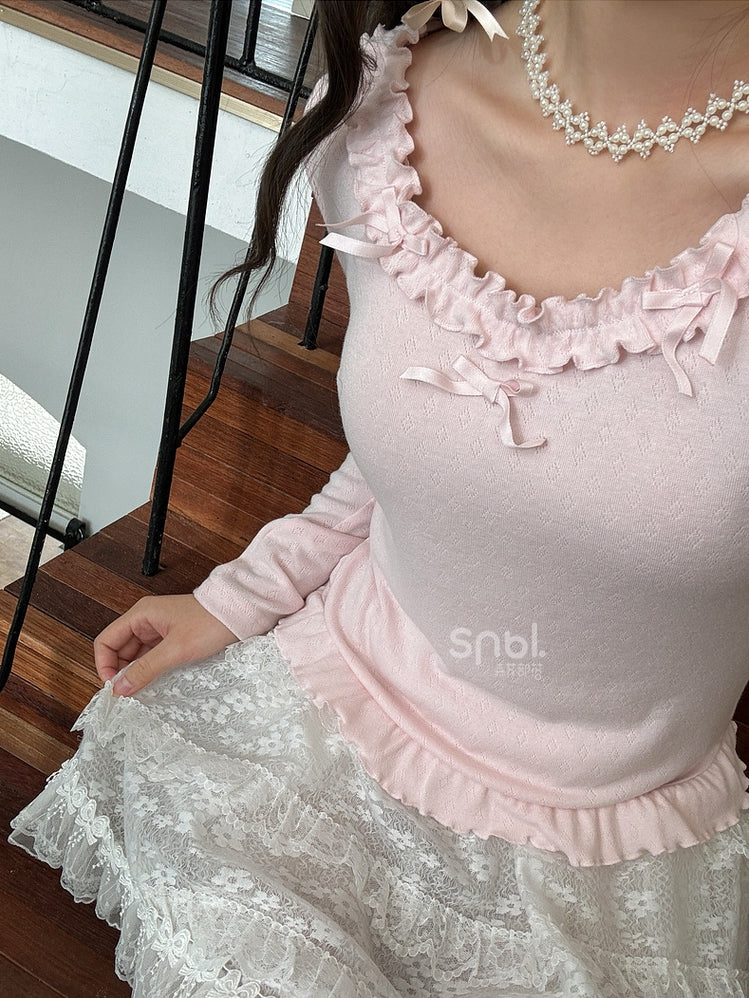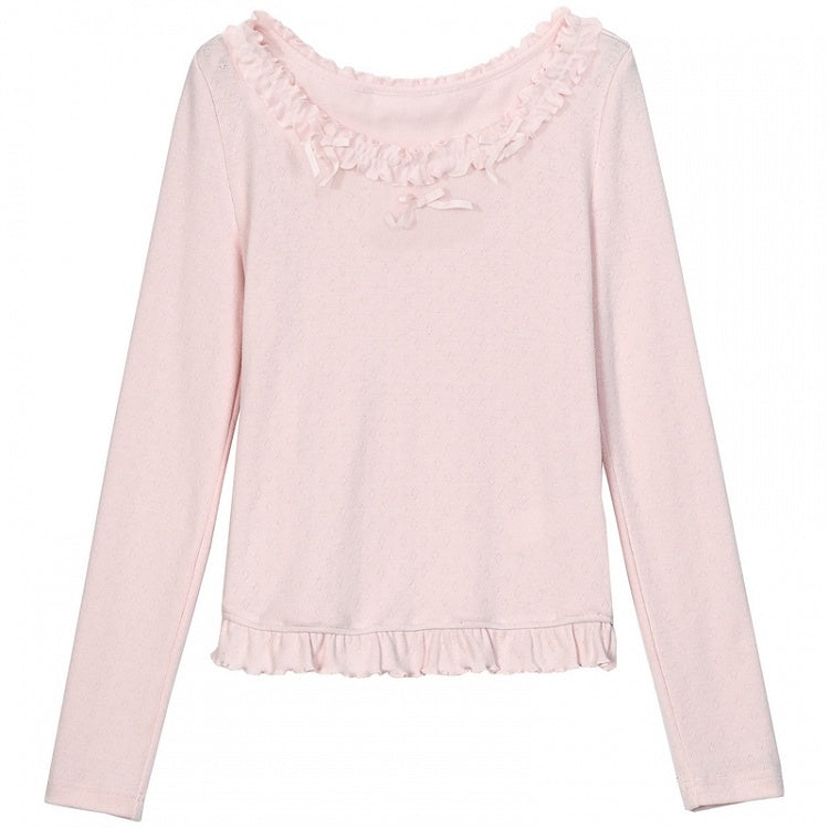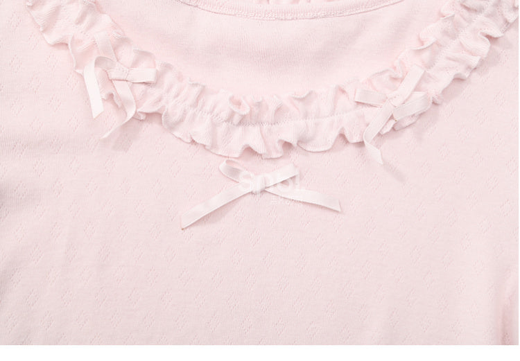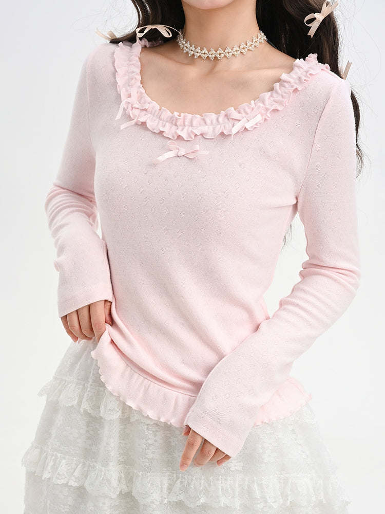 Dieses hübsche und süße rosa Oberteil verfügt über einen zarten Rüschenbesatz und bezaubernde Schleifendetails an den langen Ärmeln. Perfekt, um jedem Outfit einen Hauch von Süße zu verleihen.