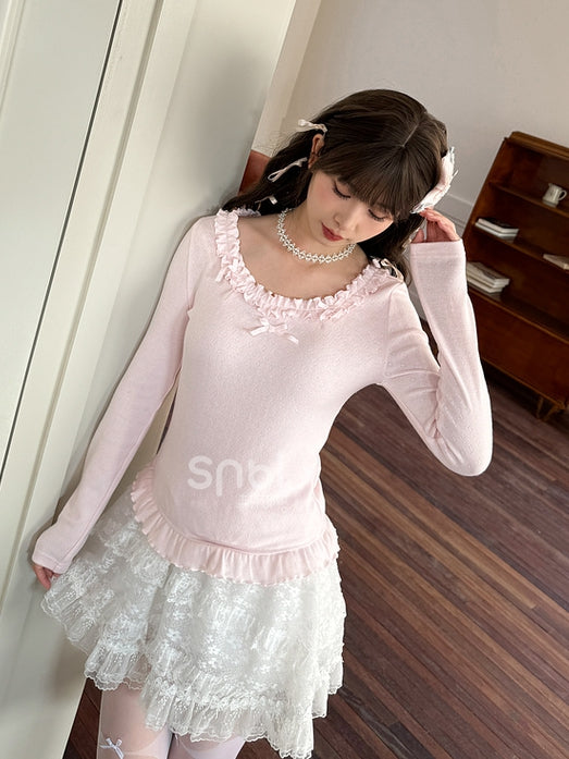 Rosafarbenes, langärmliges Oberteil mit Rüschenbesatz und Schleifendetails