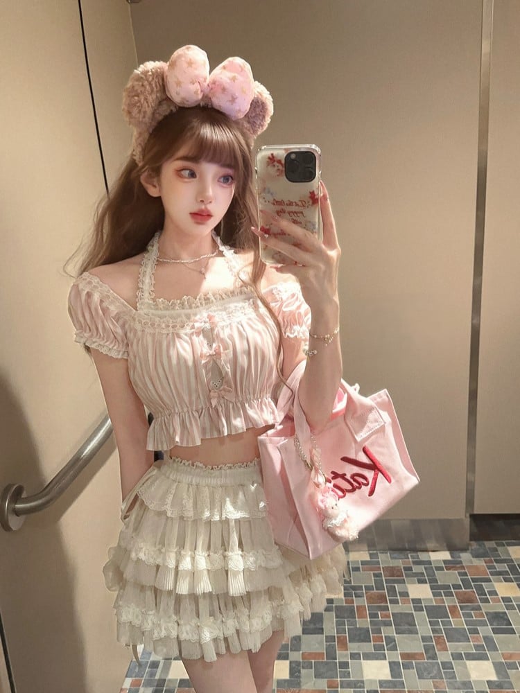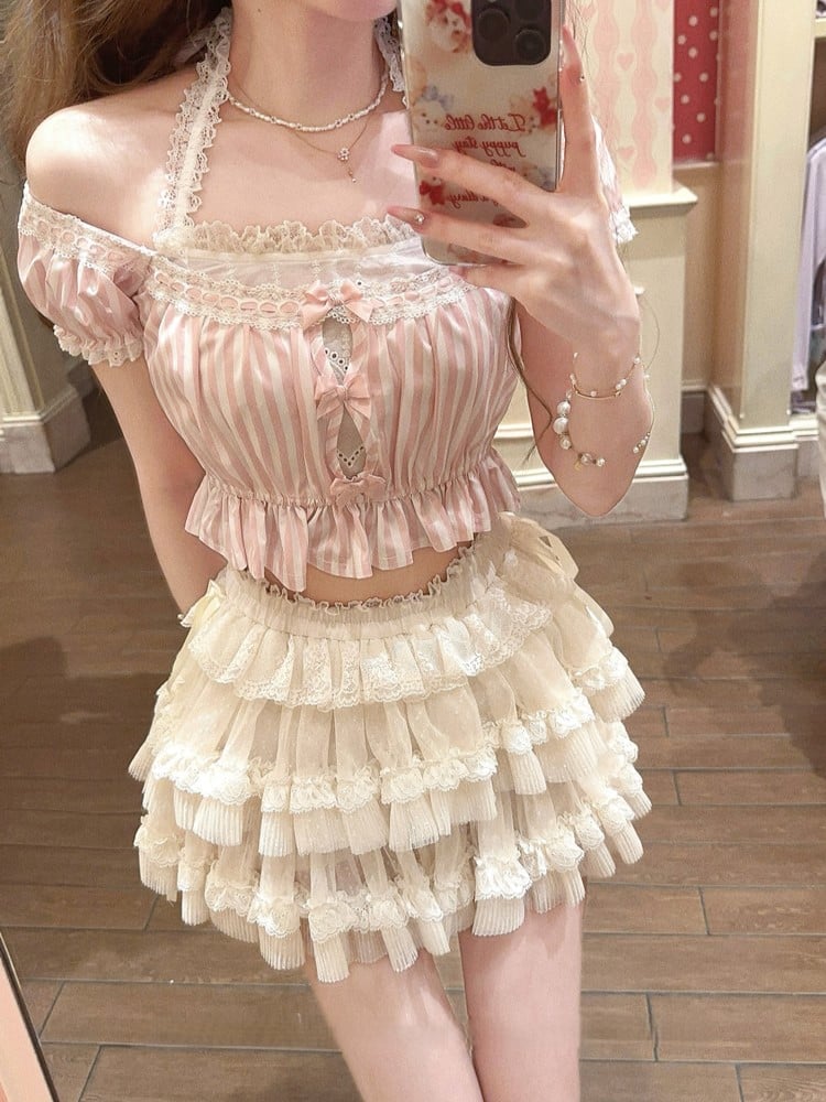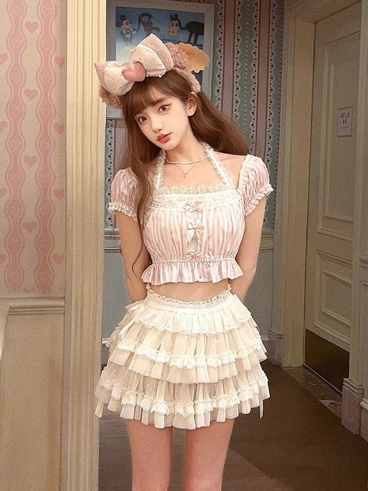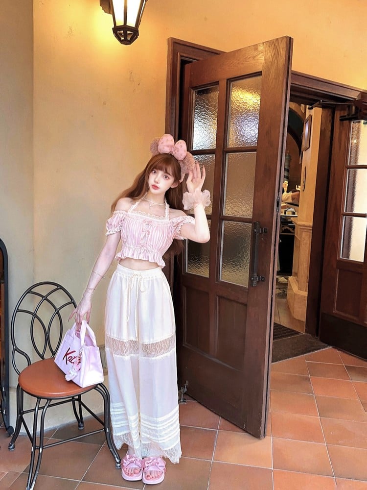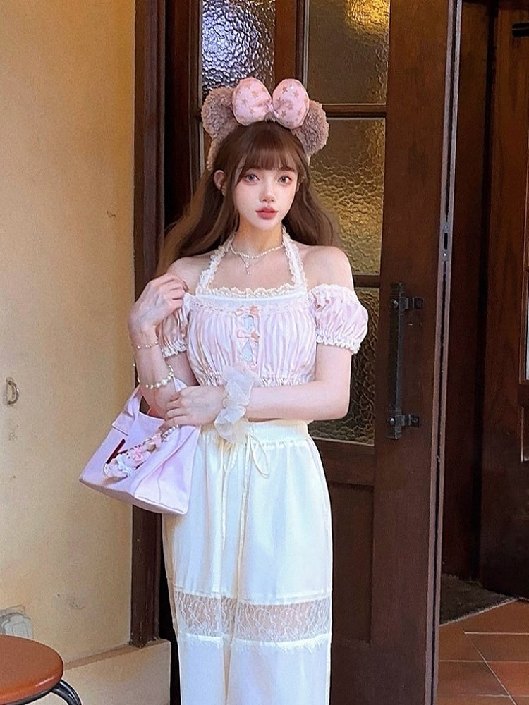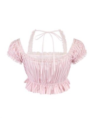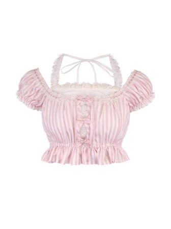 Rosa gestreiftes Neckholder-Crop-Top aus Spitze mit Schleifenakzenten und Puffärmeln