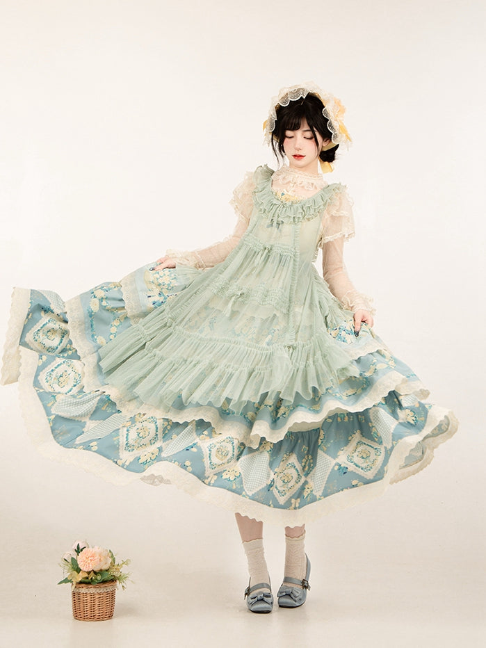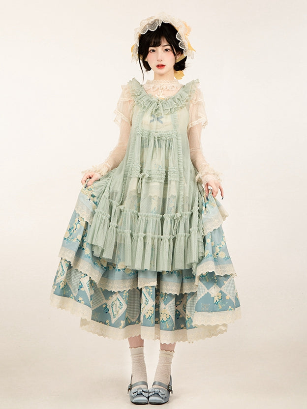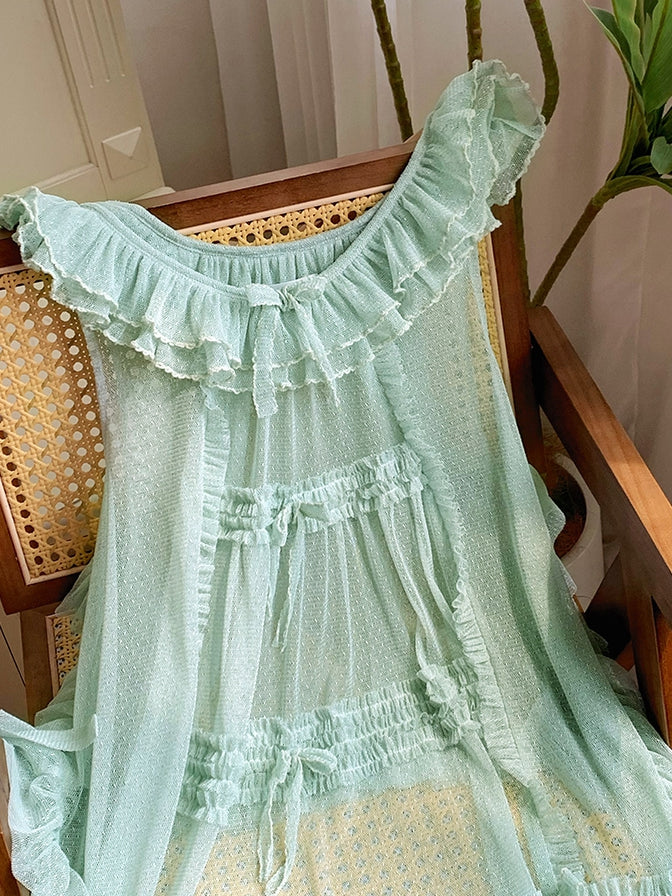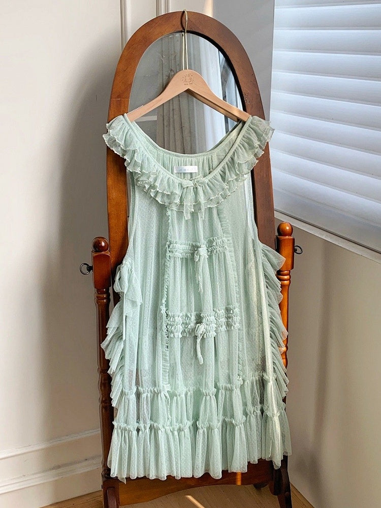 Mintgrünes Rüschenbesatz und Schleifendetails, gepunktetes Tüll-Überkleid, Pink House Style