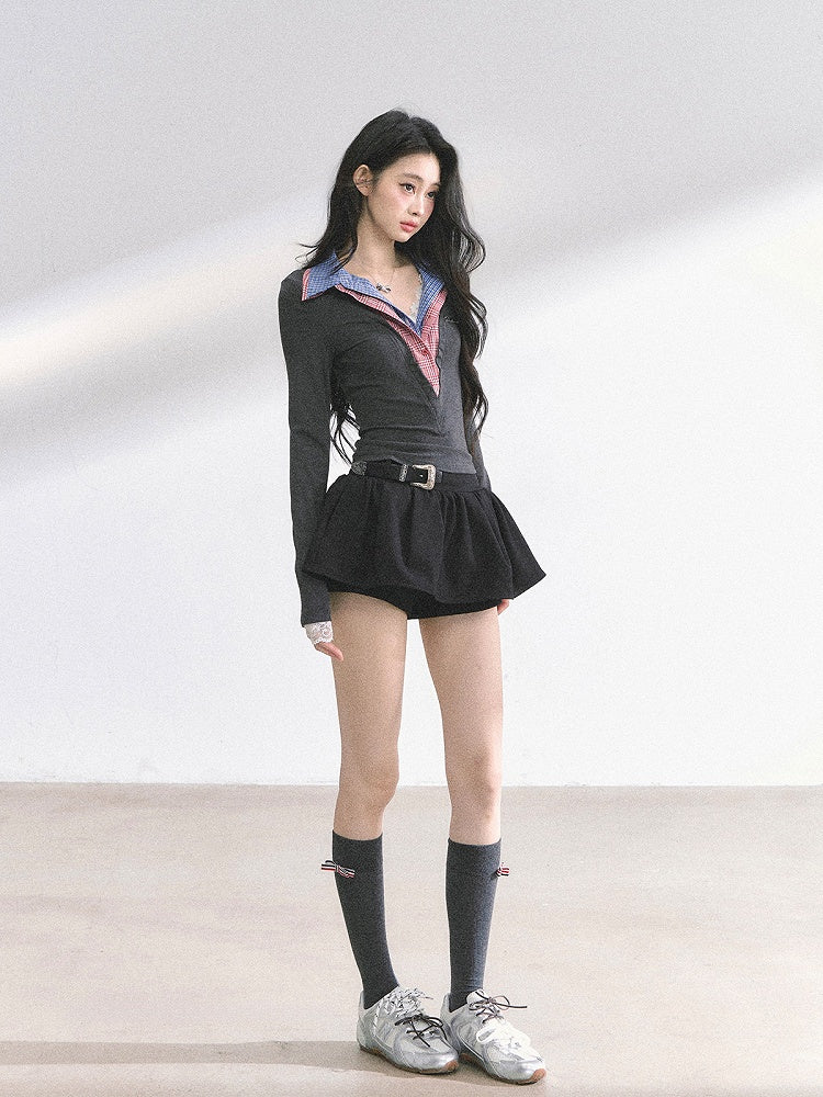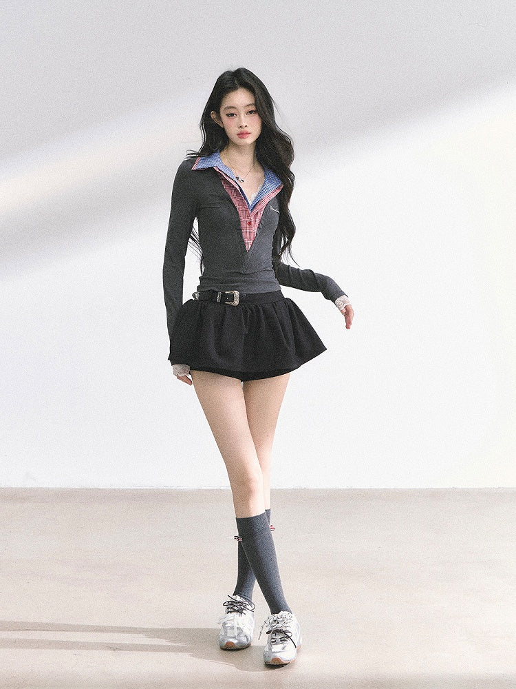 Rot karierter Kragen Graues eng anliegendes Top Faux Zweiteiler