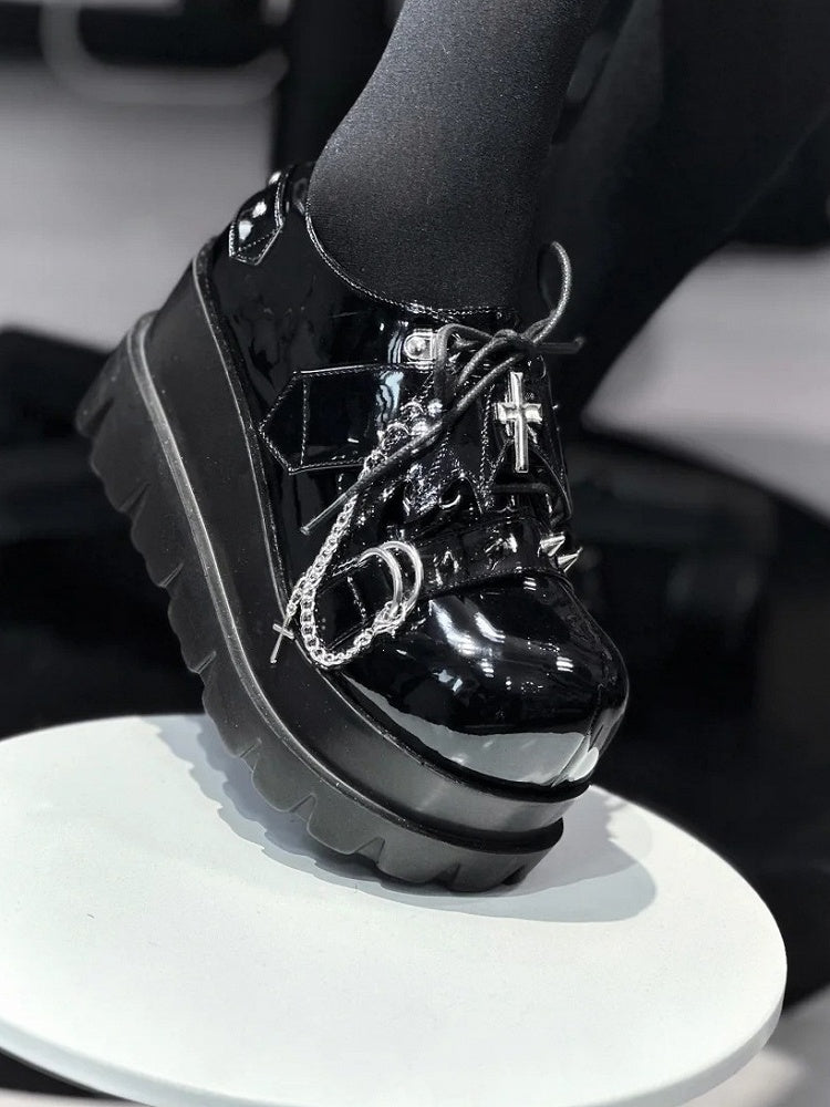 Punk Polished Black Platforms - Detachable Cross Chain Charm, Stud Details & Hybrid Lace-Up and Velcro Strap Closure System