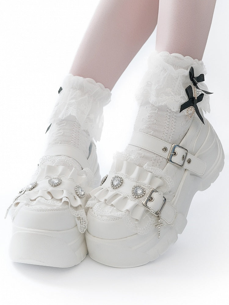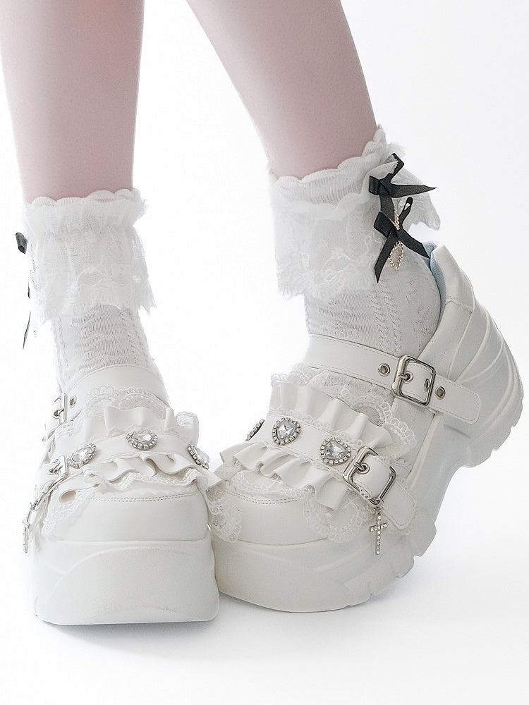 Weiße, bittersüße Plateauschuhe mit Herzdetails und Kreuzanhänger und Rüschenbesatz
