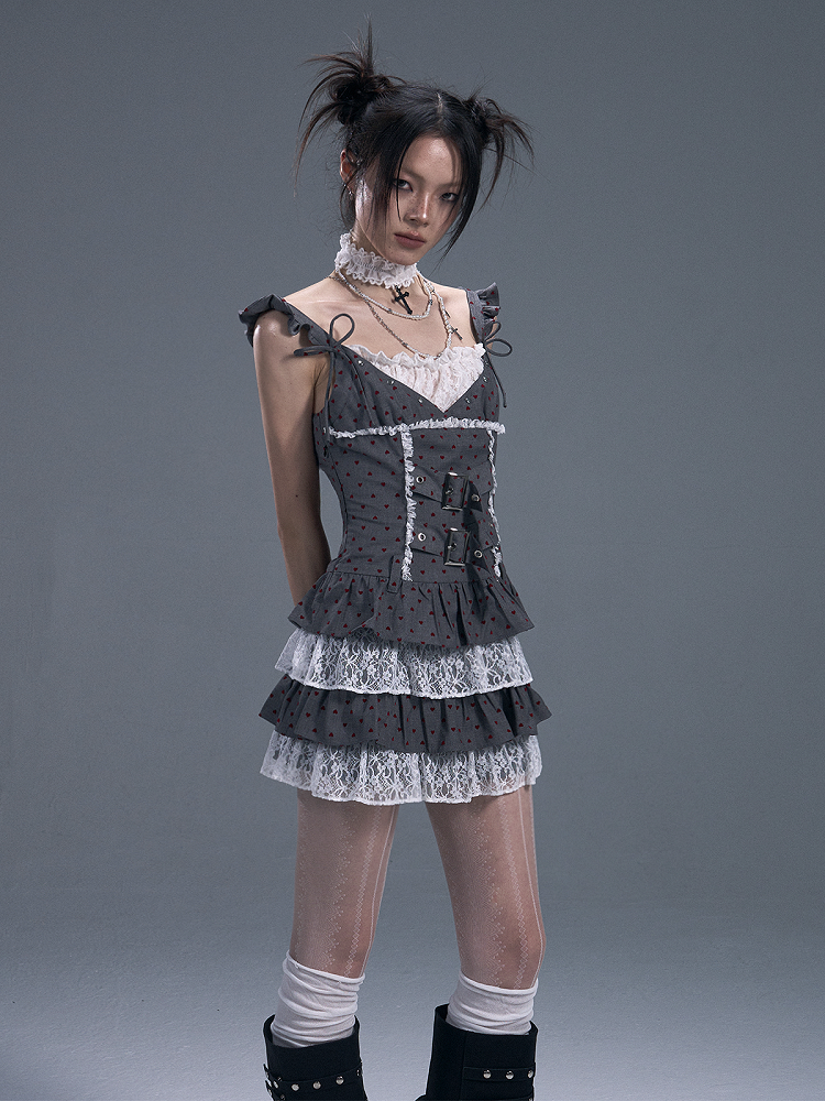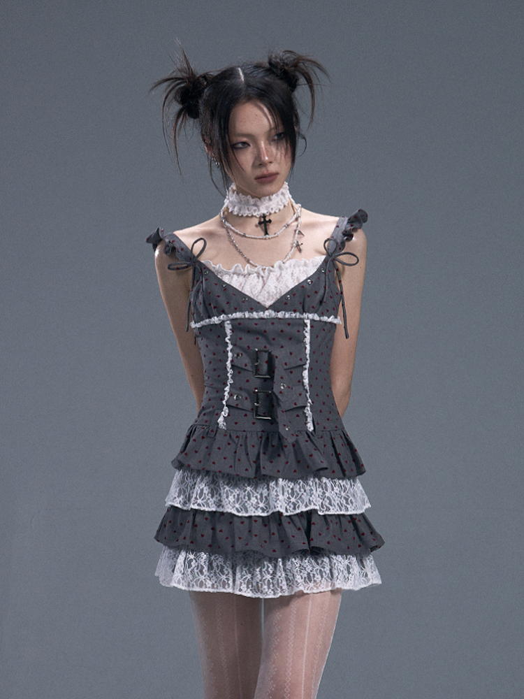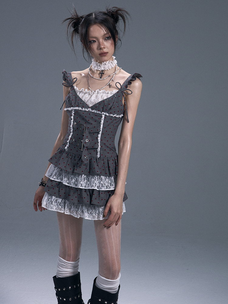 Graues, gestuftes Plissee-Unterkleid mit roten Herz-Punkten und Spitzenakzenten