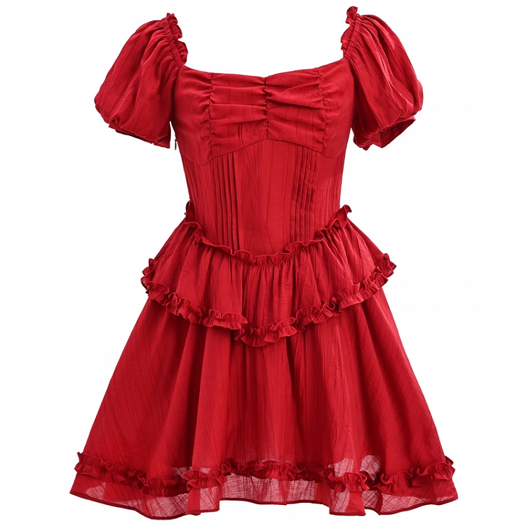 Plissierte Taille, Saumdetails, Vintage-Kleid, rot, quadratischer Ausschnitt, Puffärmel, Rüschen