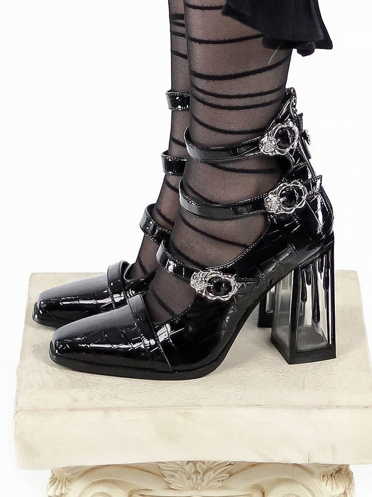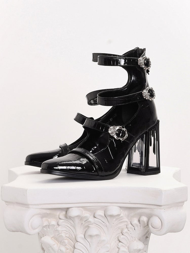 Diese polierten schwarzen Gothic-Pumps mit Krokodilschnallenriemen und Bluttropfen-Design verleihen jedem Outfit einen Hauch von Niedlichkeit. Der hohe Blockabsatz sorgt für Stil und Komfort.