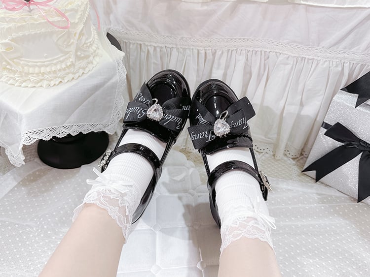 Polierte schwarze Mary Janes mit herzförmiger Strassschleife am oberen Blockabsatz