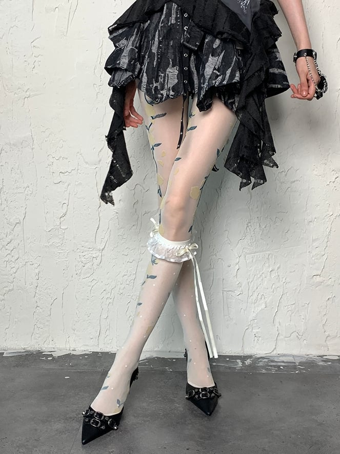 Weiße Y2K-Strümpfe mit Tupfenmuster, Rüschenbesatz und selbstbindenden Riemen unter dem Knie