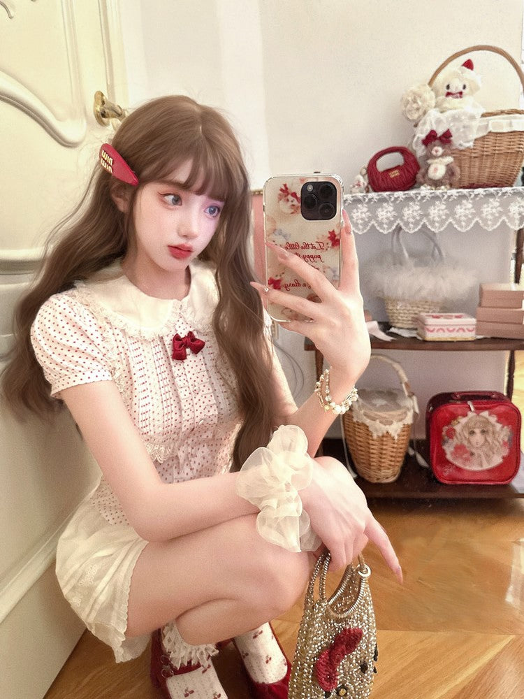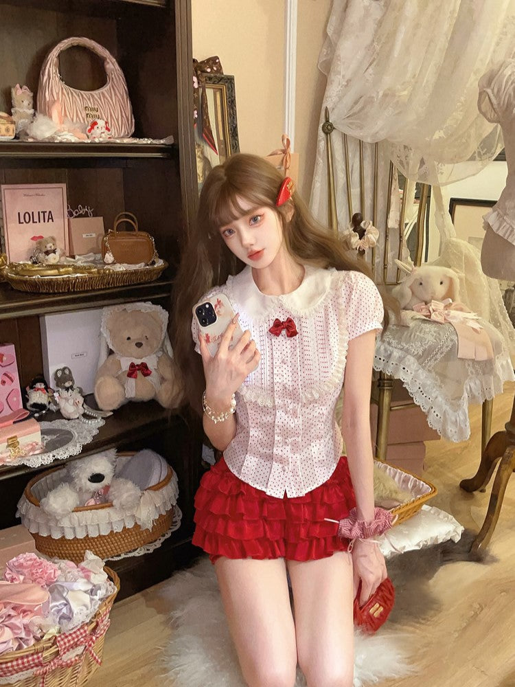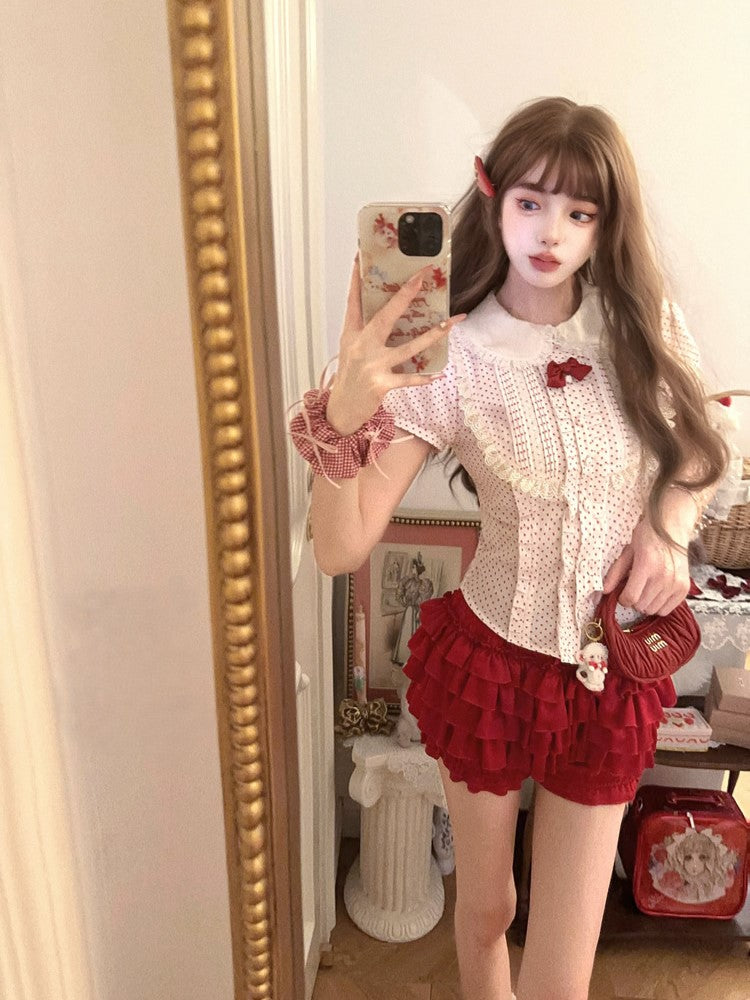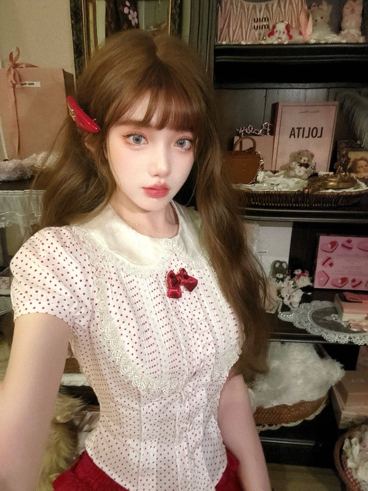 Polka mit Baumwolle Rote Bluse Punkt Akzente Weiß Dollcore