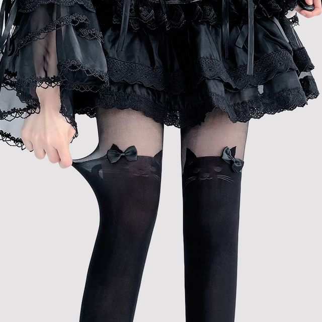 Transparente Strumpfhose mit Katzenmuster und Schleife