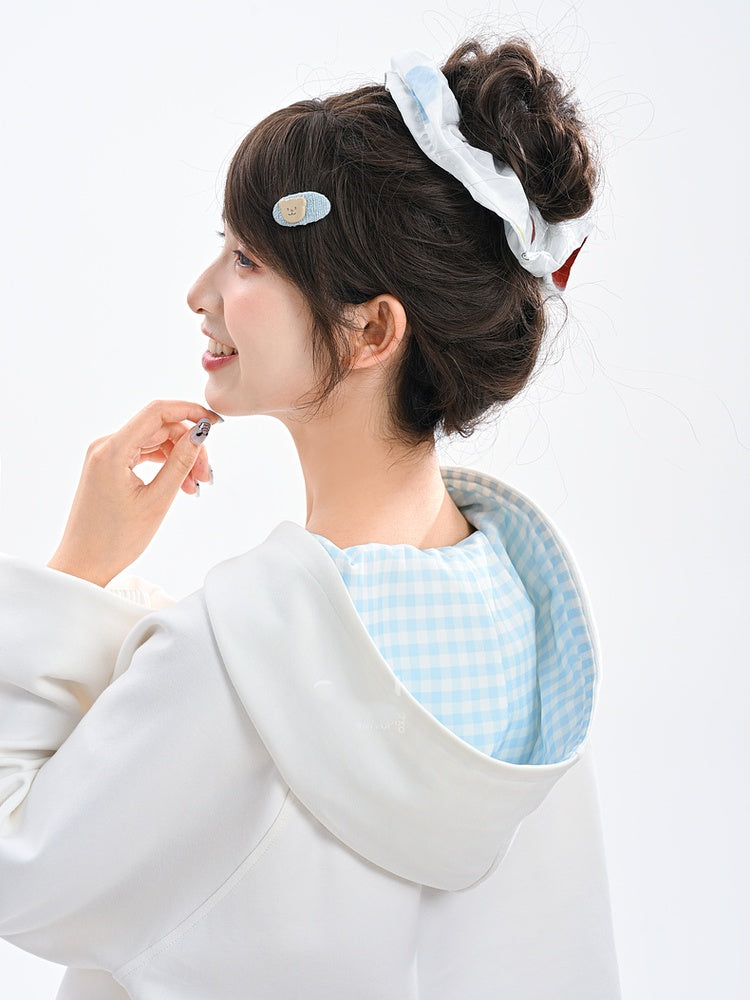 Drucken Kordelzug Saum Blau Hoodie Plaid Entzückende Cartoon Kitty Haube Weiß