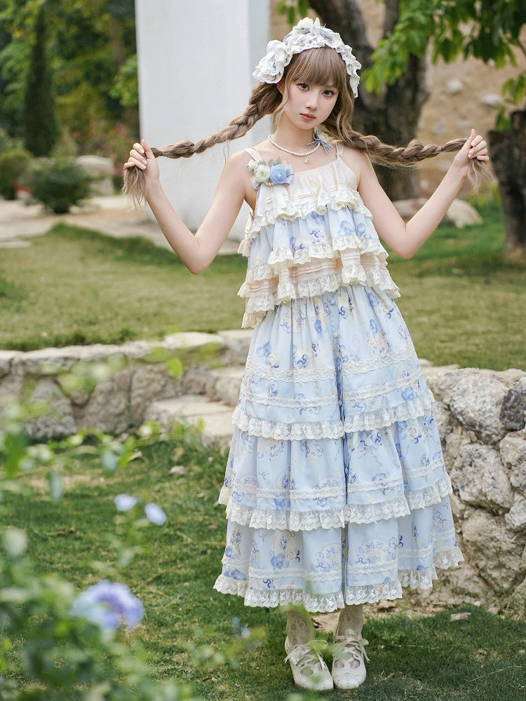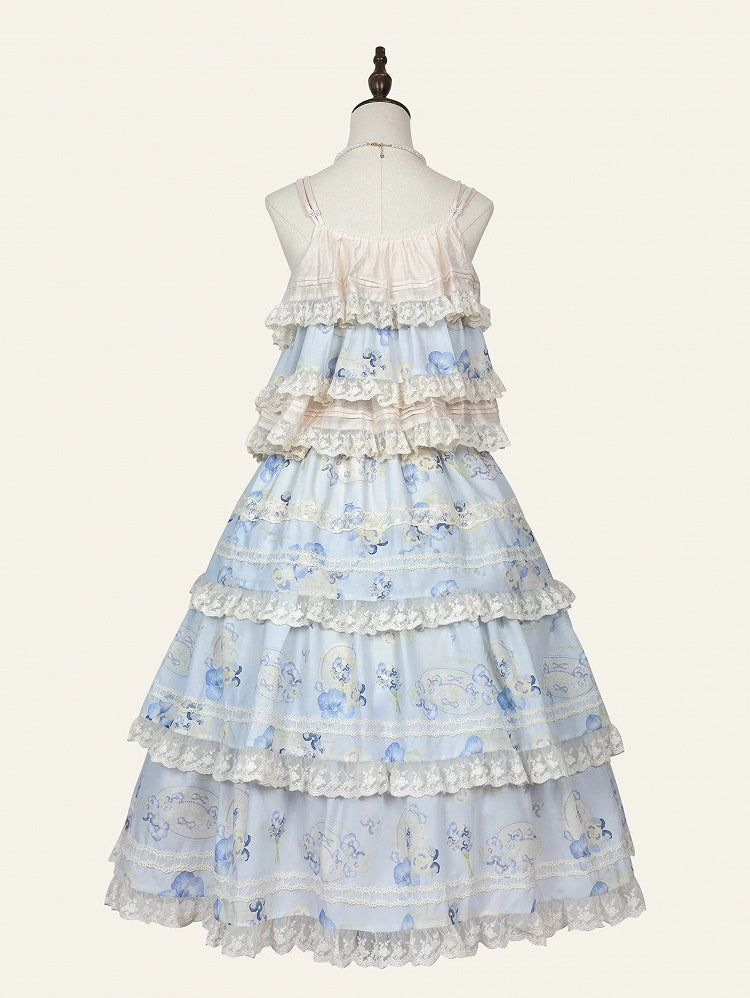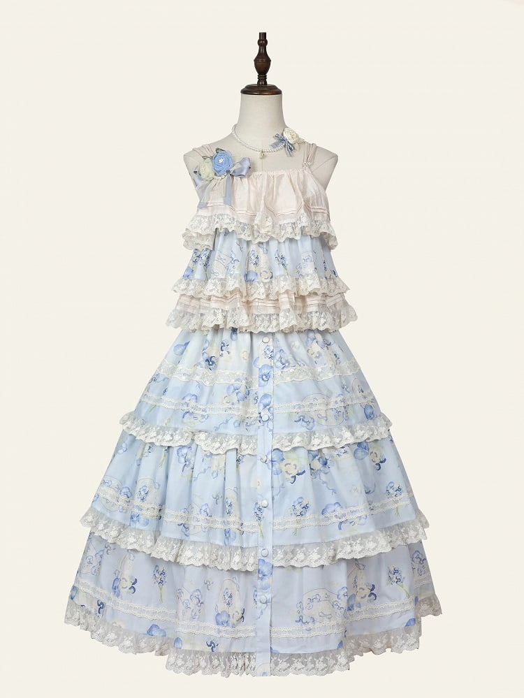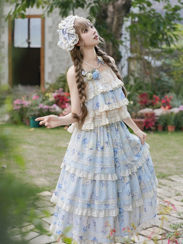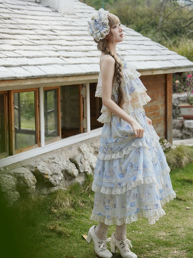 Blau-weißes Old School Lolita Fashion Kleid mit Schleife und Details, JSK-Set