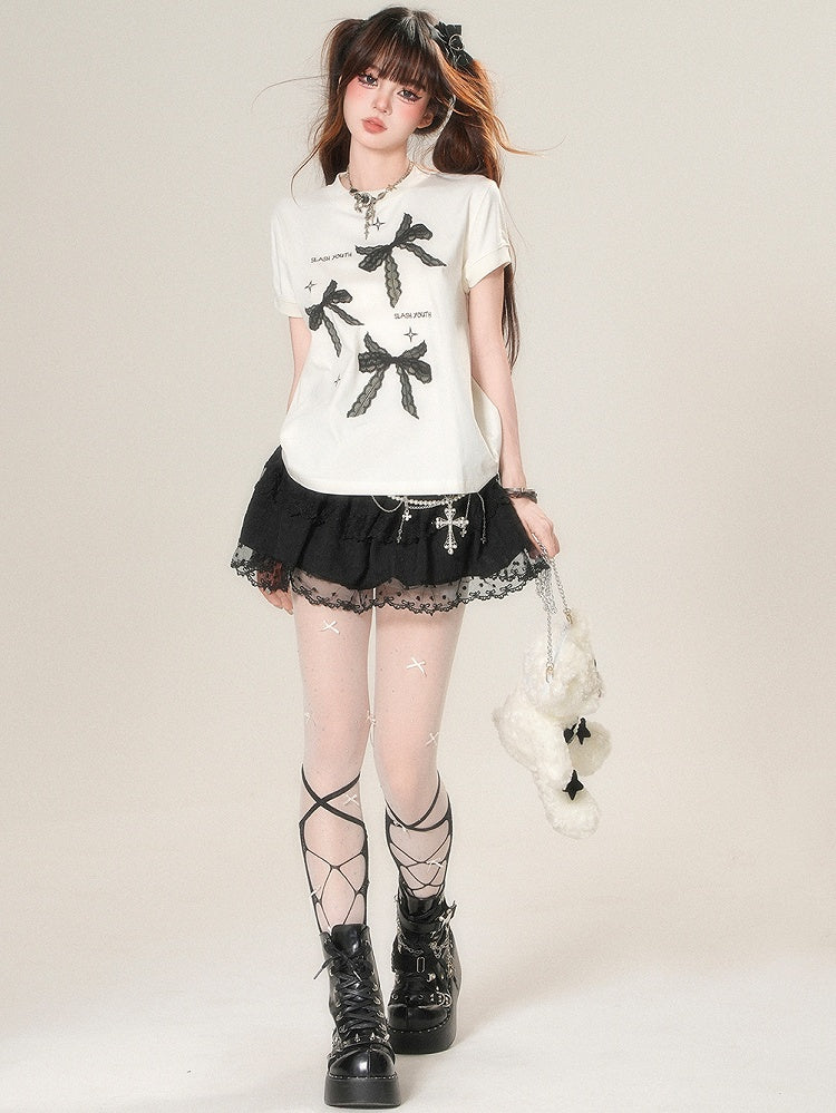 Weiß/Schwarzes Daily Kawaii T-Shirt mit Schleifenmuster