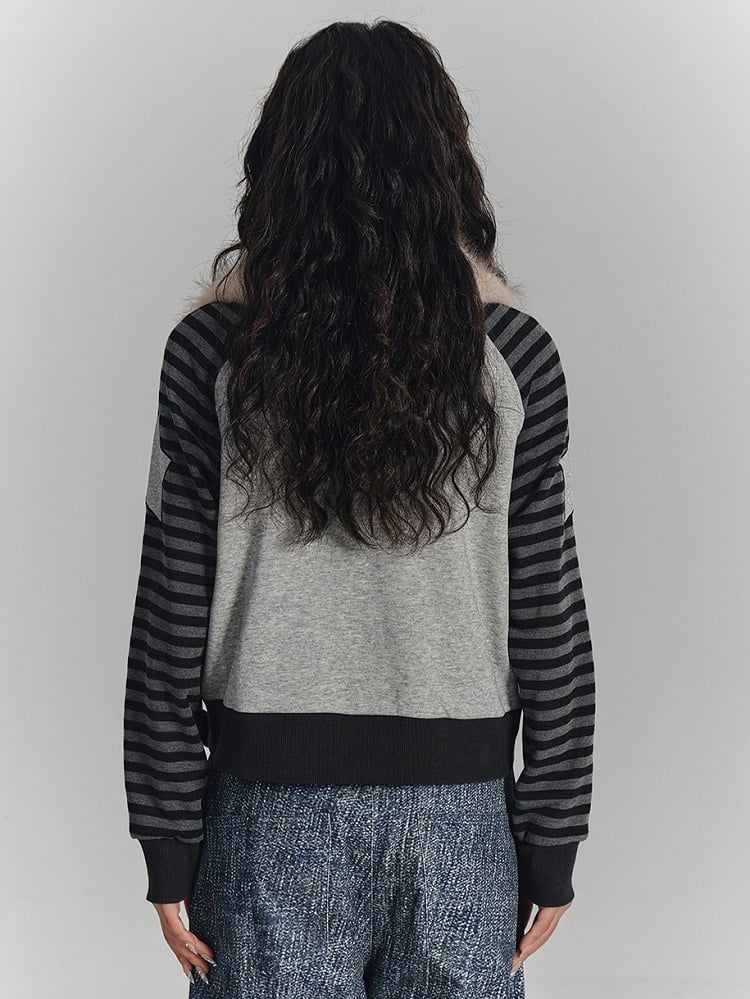 Gray Punk Zip-Up Faux Fur Collar Jacket with Wing Print & Striped Sleeves