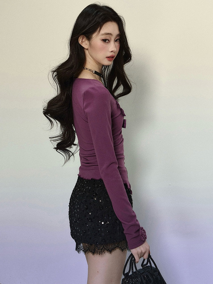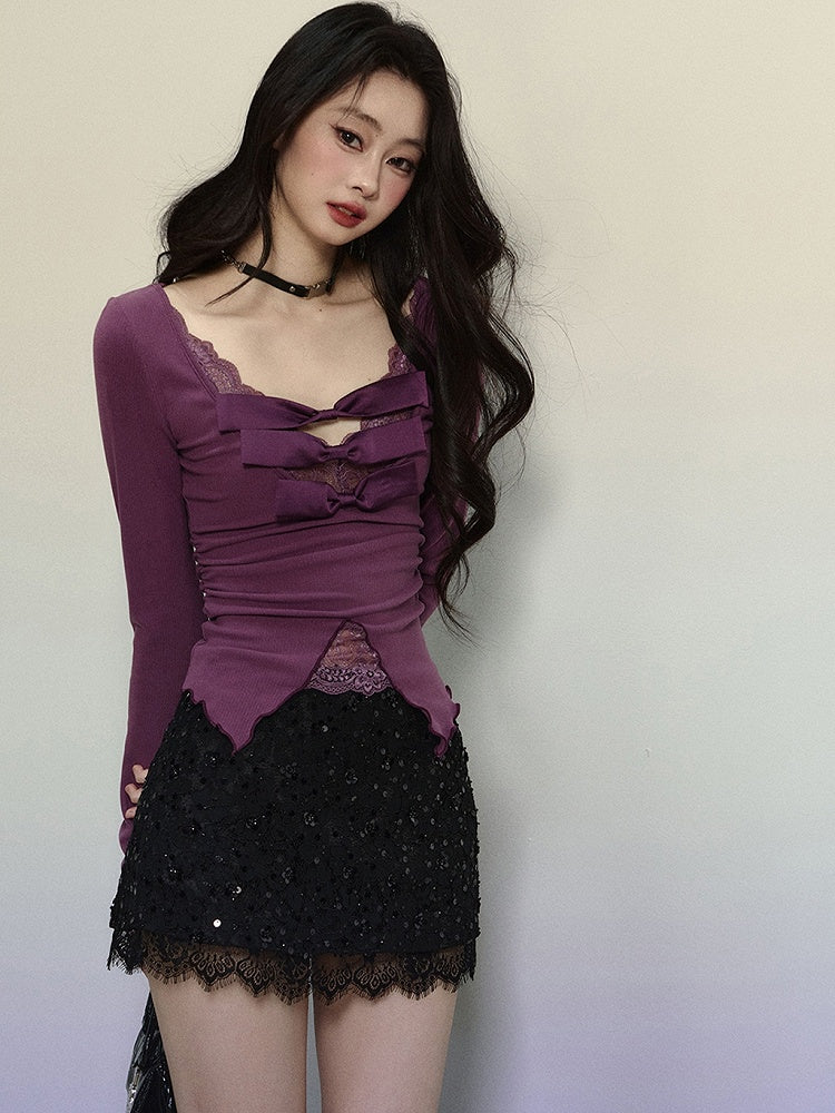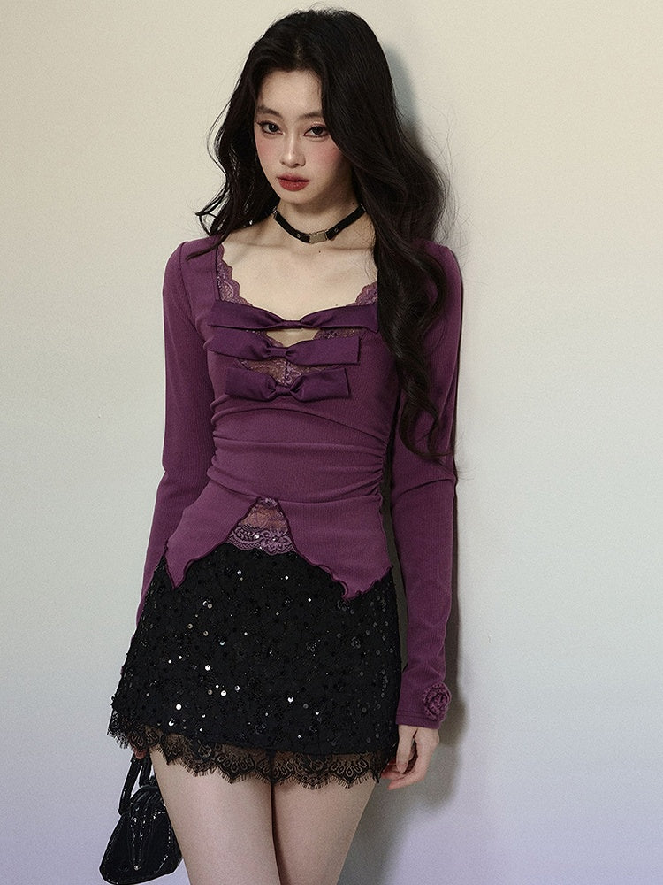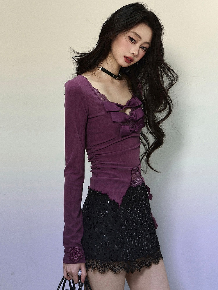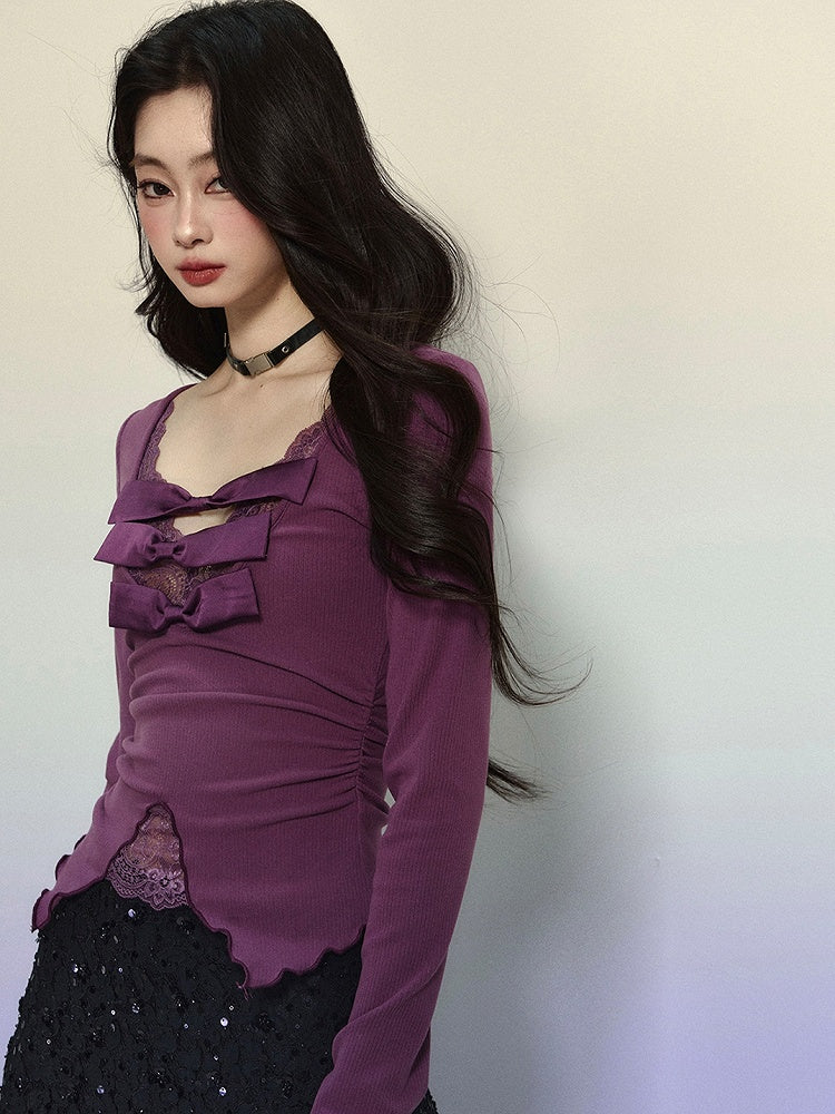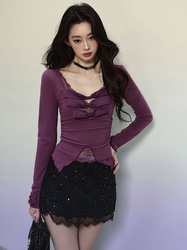 Dieses süße Top besticht durch eine hübsche lila Schleife, einen zarten Spitzenbesatz und einen schmeichelnden V-Ausschnitt. Mit seinen langen Ärmeln verleiht es jedem Outfit eine süße Note.