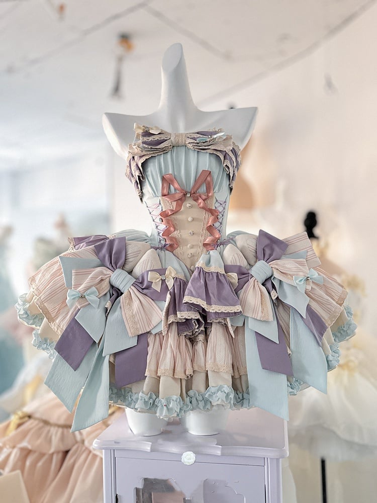 Lila Schleifenrock, große Schnürung, baskische Taille, gestufte Rüschen, süßes Lolita-Kleid und mit Blau auf
