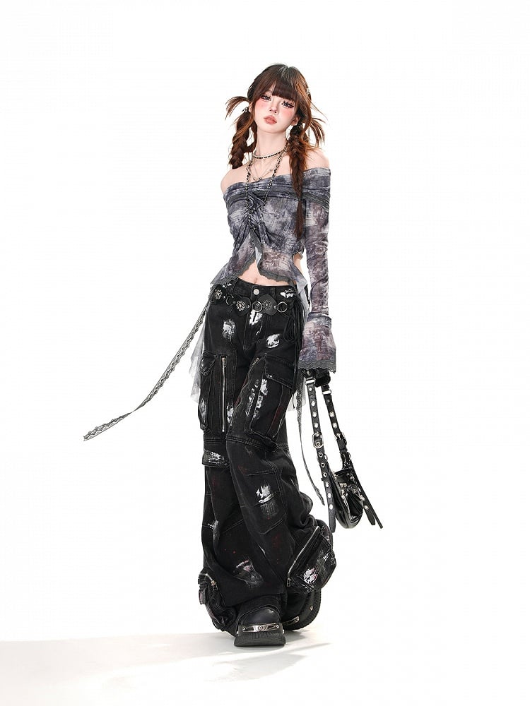Lila/Graues, schulterfreies Top mit Kordelzug