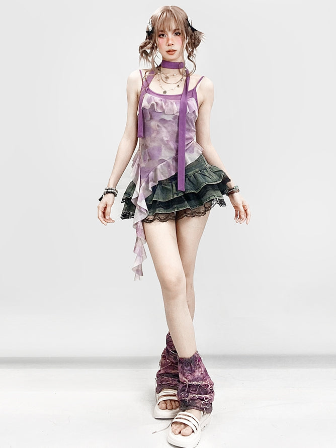 Lila Saum Asymmetrische Rüschen Top Design Dye + Tie Cami Schal Y2K Trim