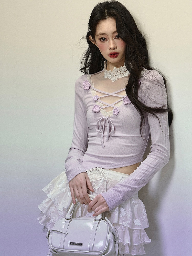 Dieses wunderschöne Top besticht durch einen violetten Illusionsausschnitt, überkreuzte Träger und florale Verzierungen. Der asymmetrische Saum verleiht dem Oberteil einen Hauch von Charme. Perfekt, um jedem Outfit eine süße Note zu verleihen.