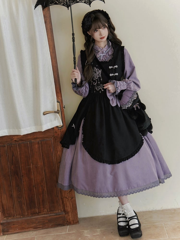 Lila Maiglöckchen, schwarze Schürze mit gewelltem Rand und Saum