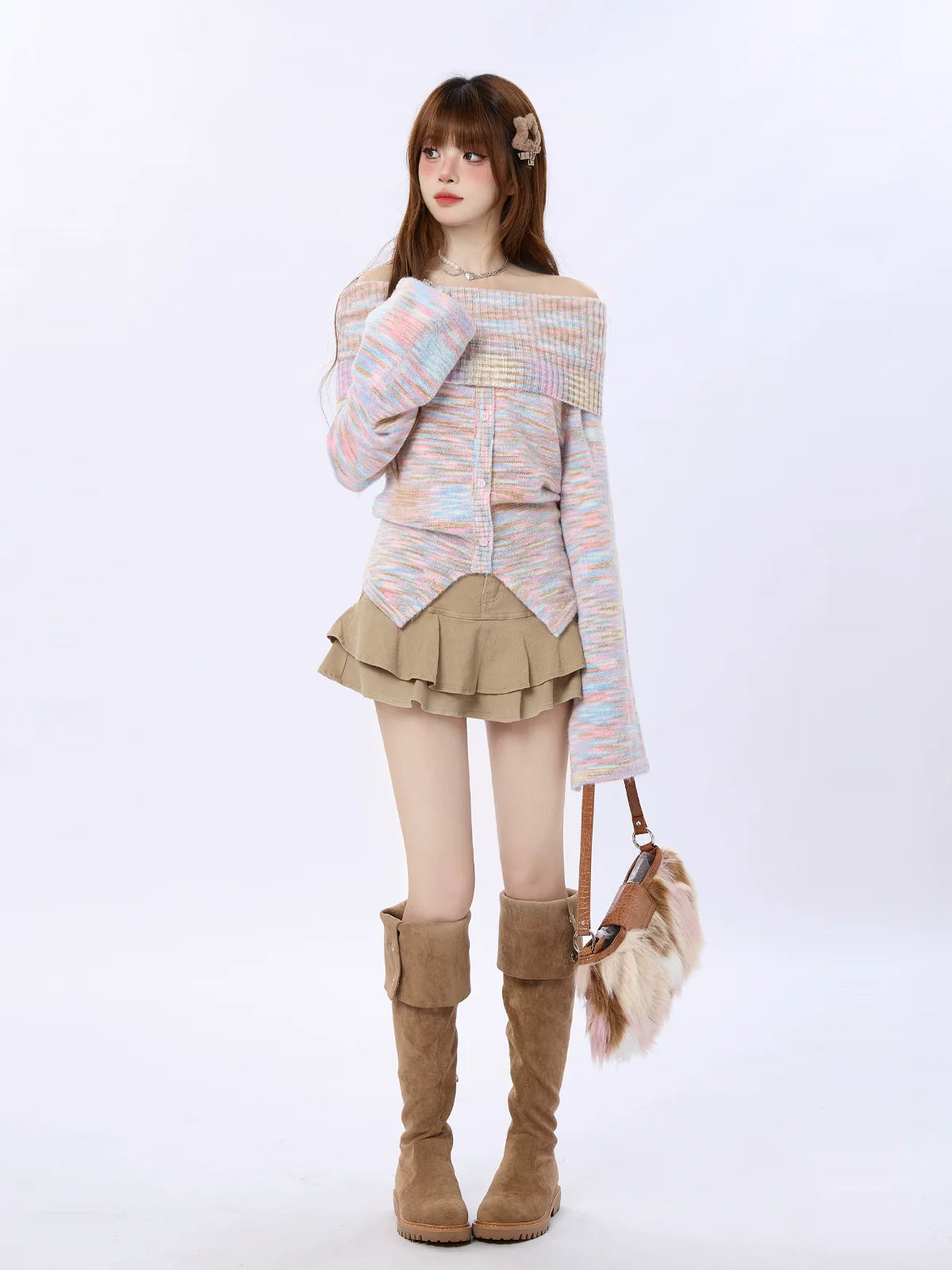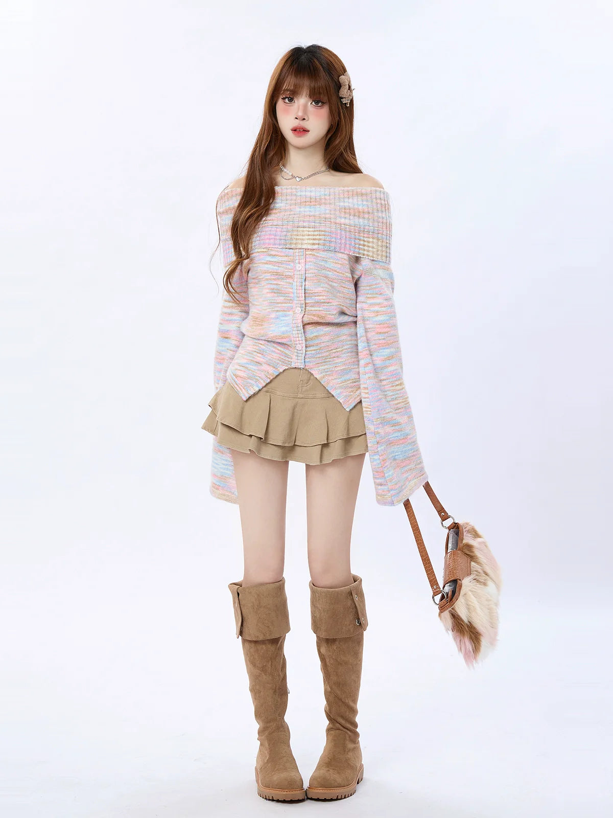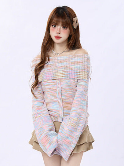 Schulterfreier Strickpullover aus reinem Dzire-Streifen in Regenbogenfarben