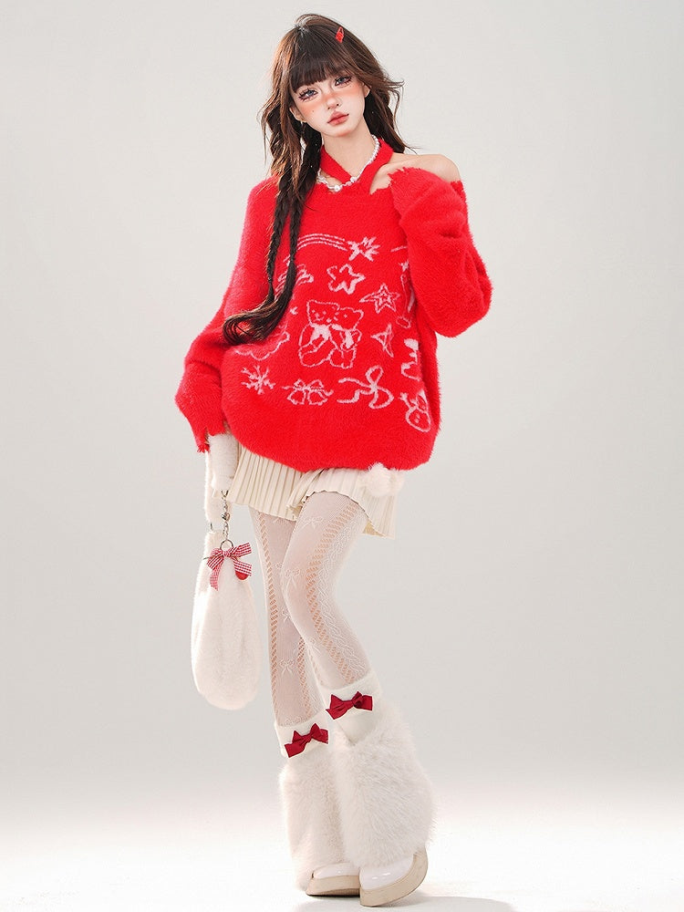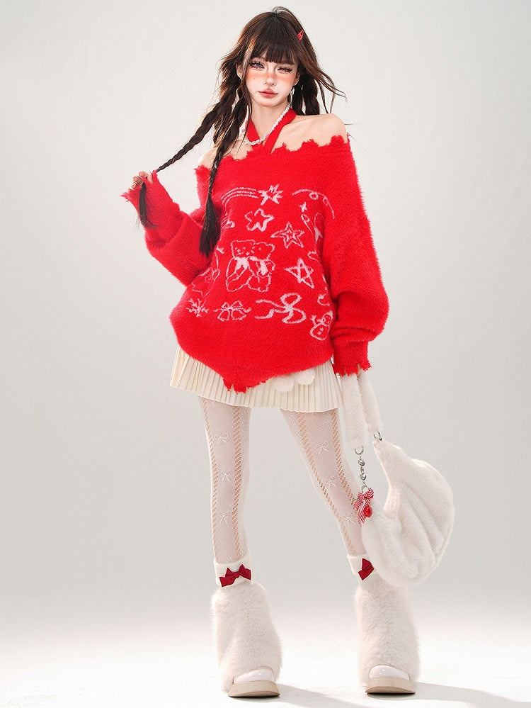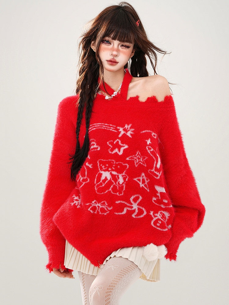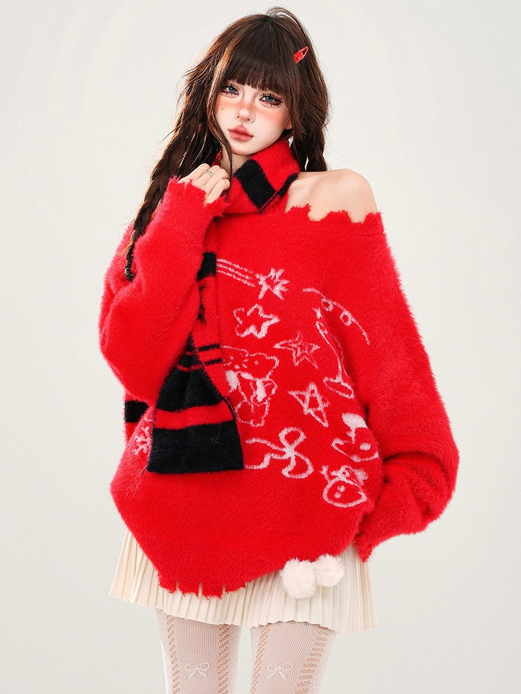 Lockerer Neckholder-Pullover mit roten Bären und Sternen und kostenlosem Schal