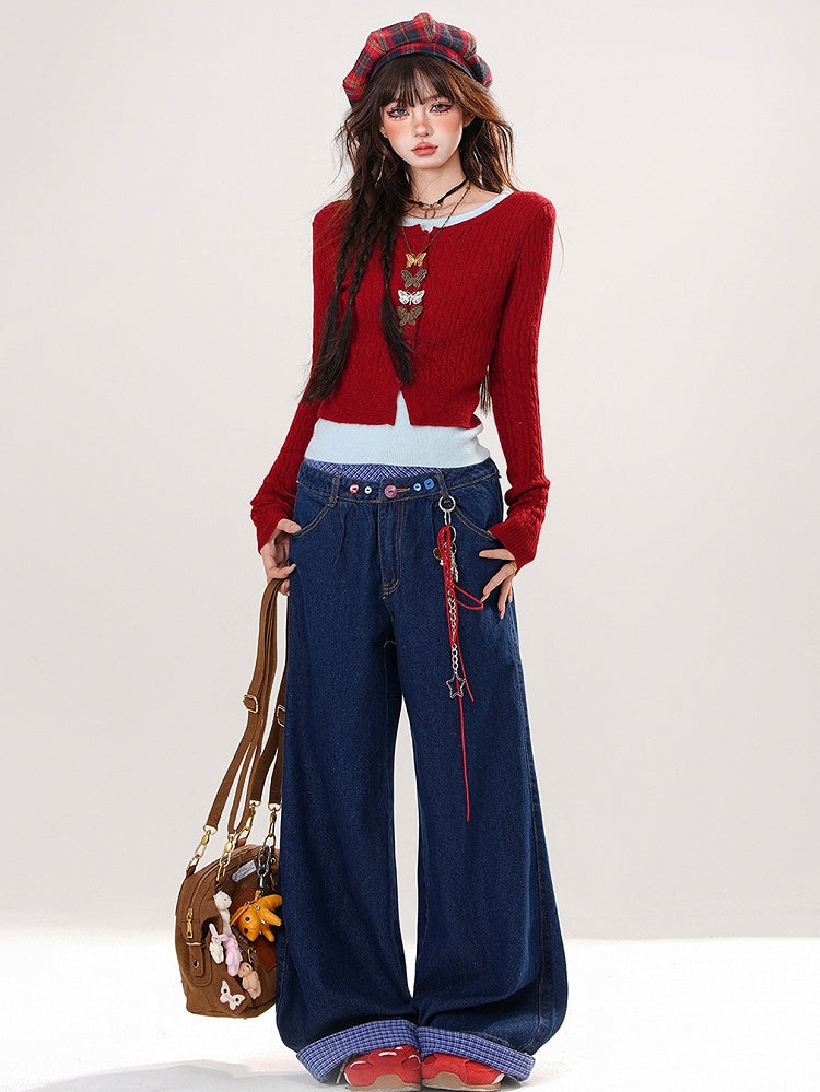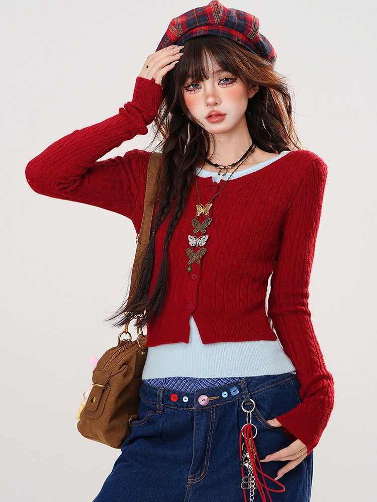 Rot/Schwarz/Grau Fake Zweiteiler Slim Fit Stricktop