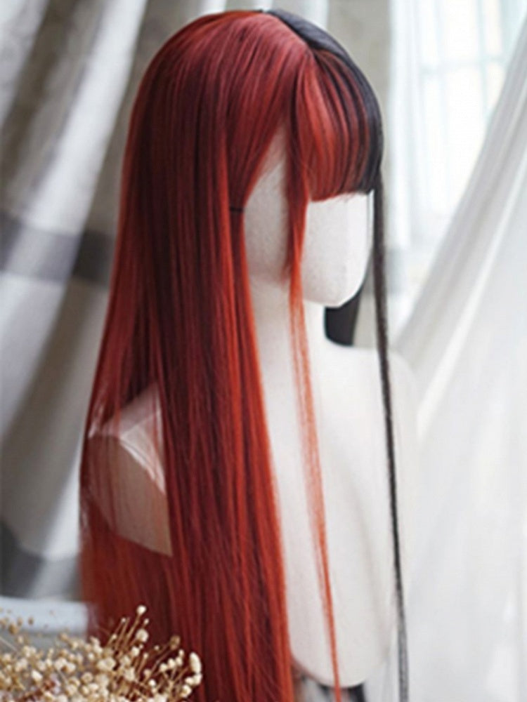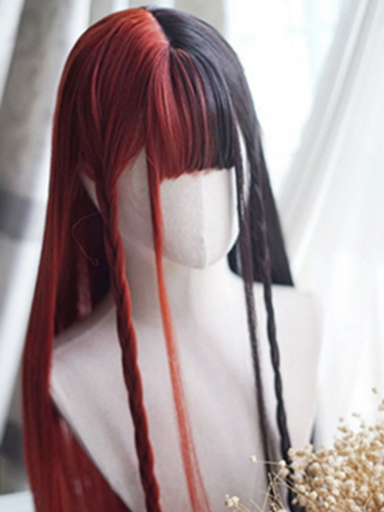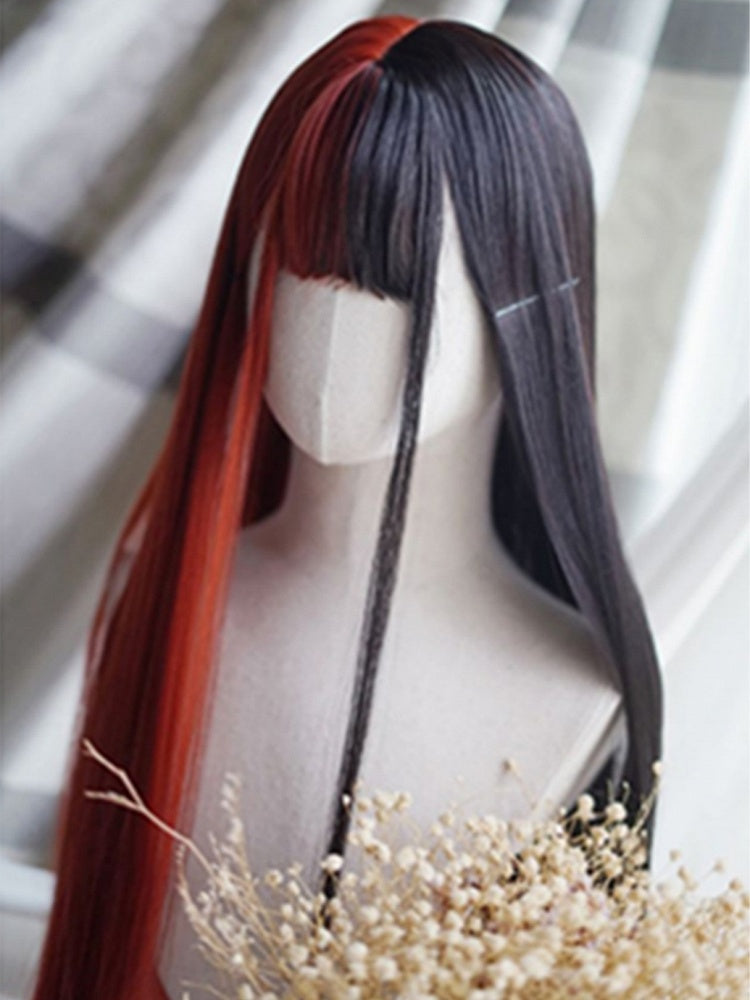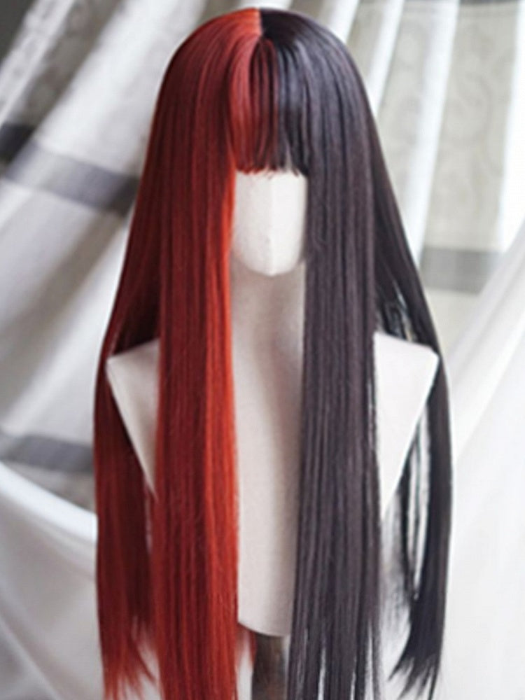 Rot-schwarze, geteilte, hüftlange, glatte Perücke mit vollem Pony